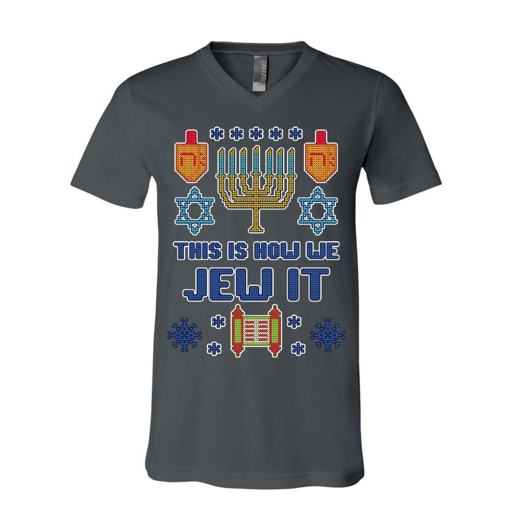 THIS IS HOW WE JEW IT UGLY SWEATER this is how we jew it ugly v-neck t-shirt hannukah torah menorah funny tee charcoal