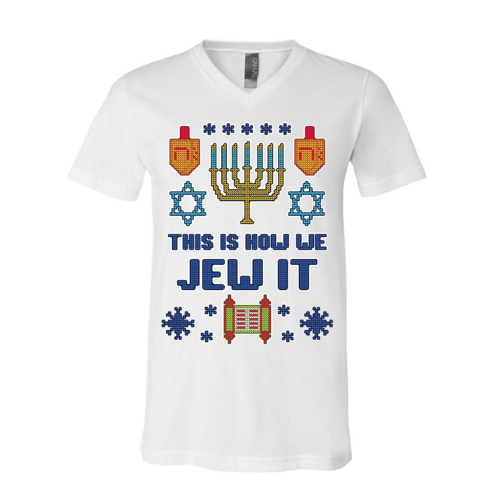 THIS IS HOW WE JEW IT UGLY SWEATER this is how we jew it ugly v-neck t-shirt hannukah torah menorah funny tee white
