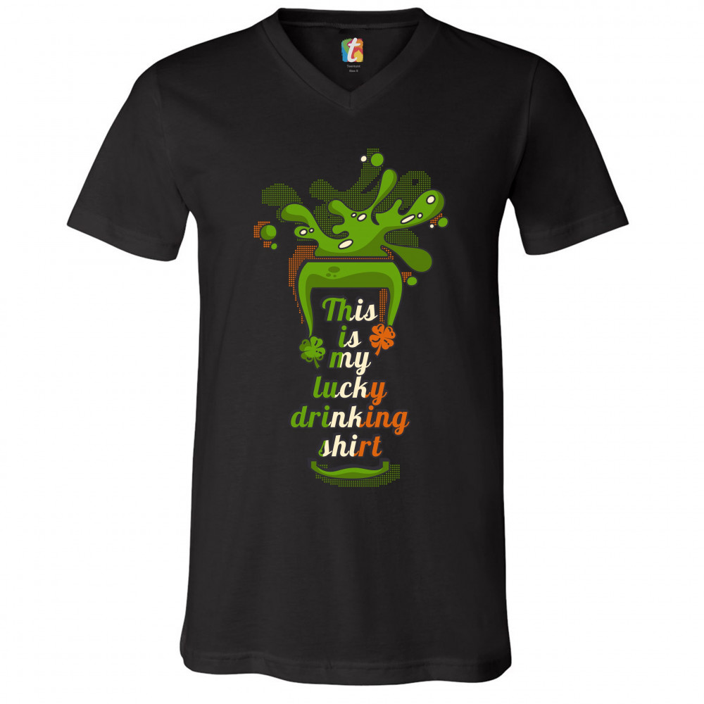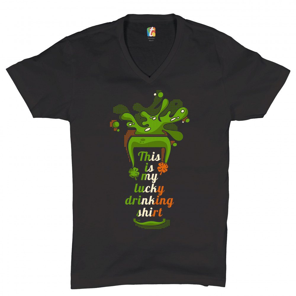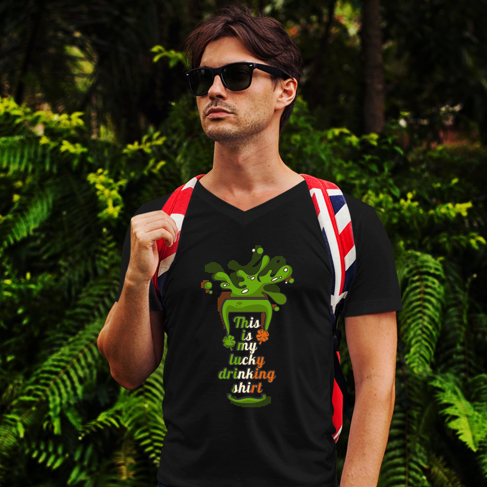 A print featuring a silhouette of a glass with beer spilling out of it. Inside the glass there is a text: "This is my lucky drinking shirt" in the colors of the flag of Ireland. A great choice to wear on March 17 to celebrate the St. Patrick's Day and sho