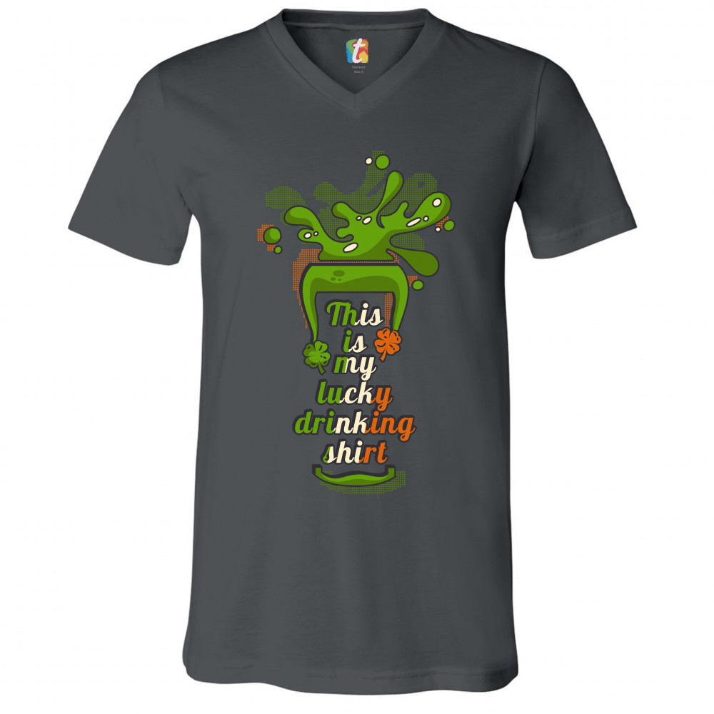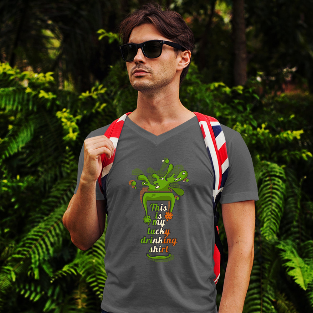 A print featuring a silhouette of a glass with beer spilling out of it. Inside the glass there is a text: "This is my lucky drinking shirt" in the colors of the flag of Ireland. A great choice to wear on March 17 to celebrate the St. Patrick's Day and sho