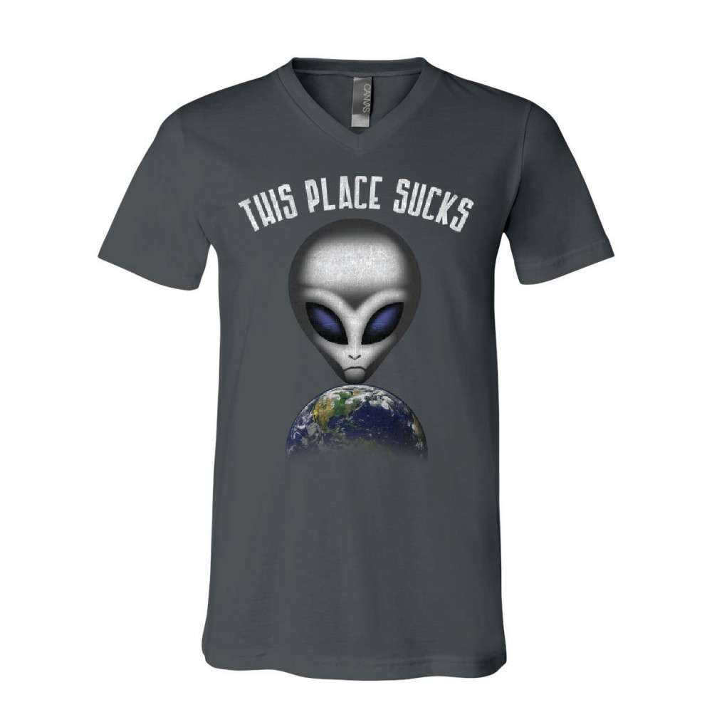 THIS PLACE SUCKS v-neck t-shirt funny ufo alien space universe earth tee charcoal