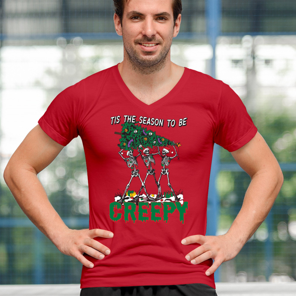 "Tis the Season to Be Creepy" combines holiday cheer with a hauntingly fun twist. This creative design features skeletons donning Santa hats as they carry a spooky Christmas tree decorated with eerie ornaments. Perfect for holiday gatherings, Secret Santa gifts, or themed parties, this design celebrates the festive and the macabre. Embrace the jolliest and creepiest bunch this season with this standout apparel.