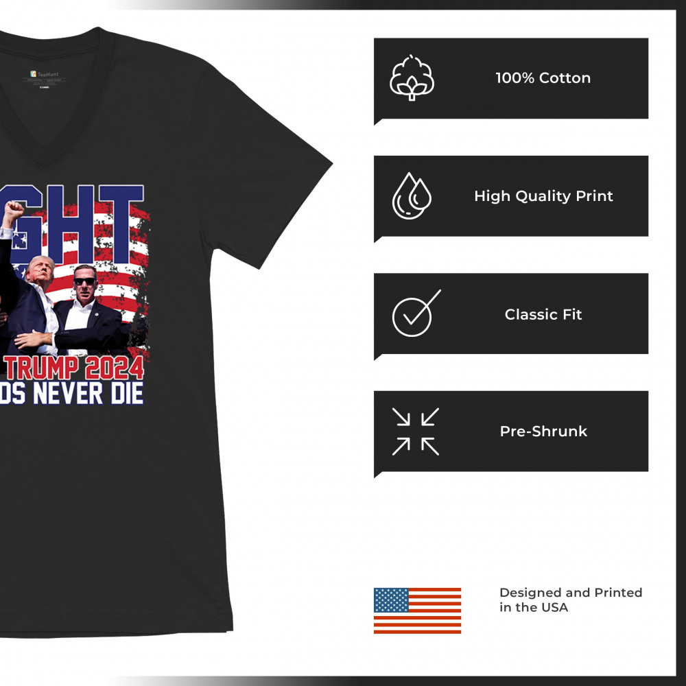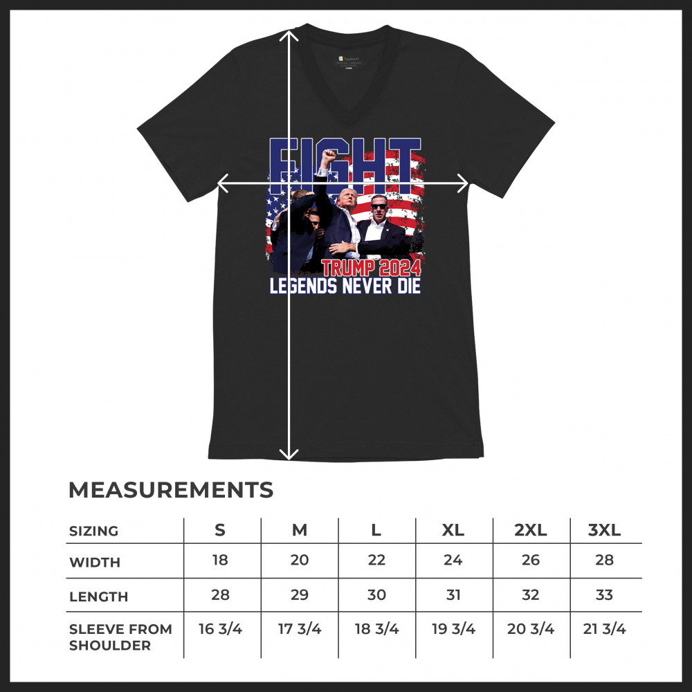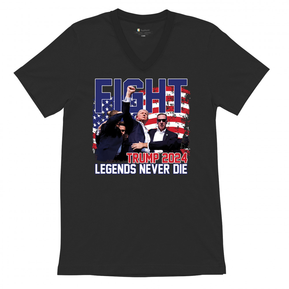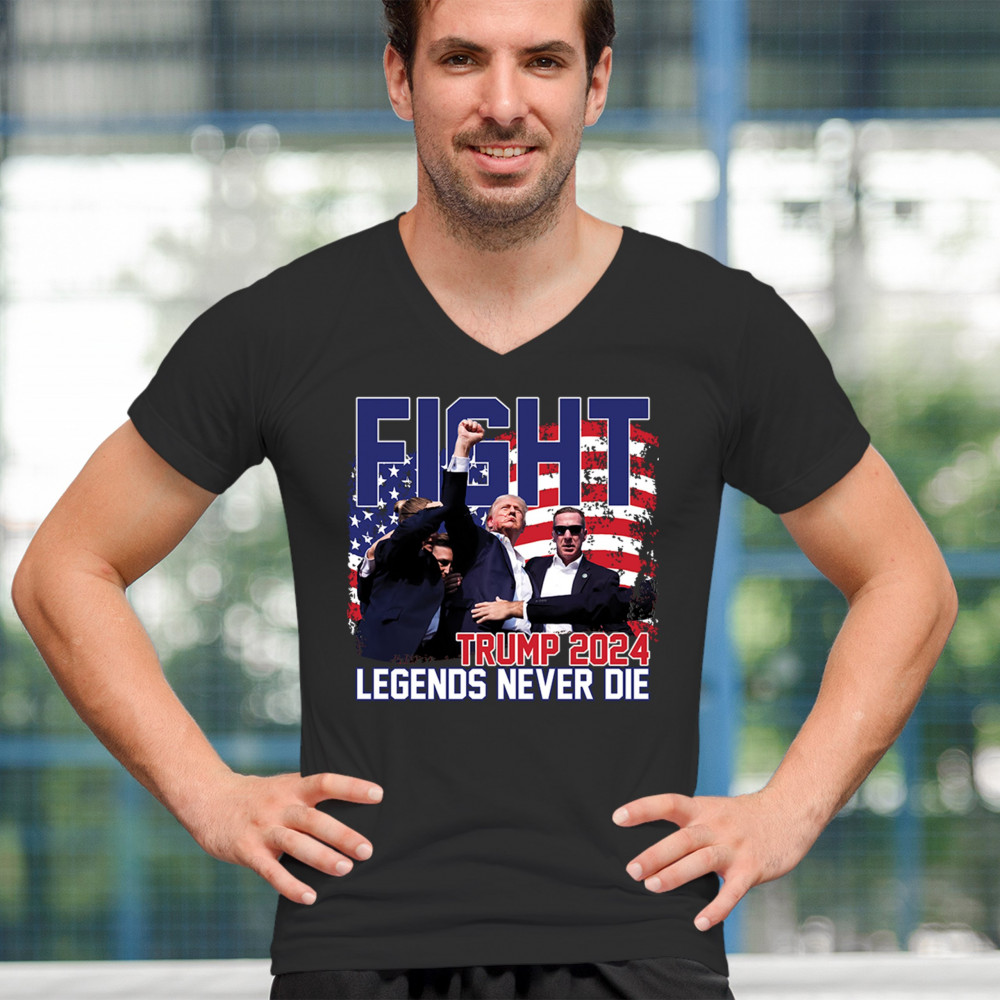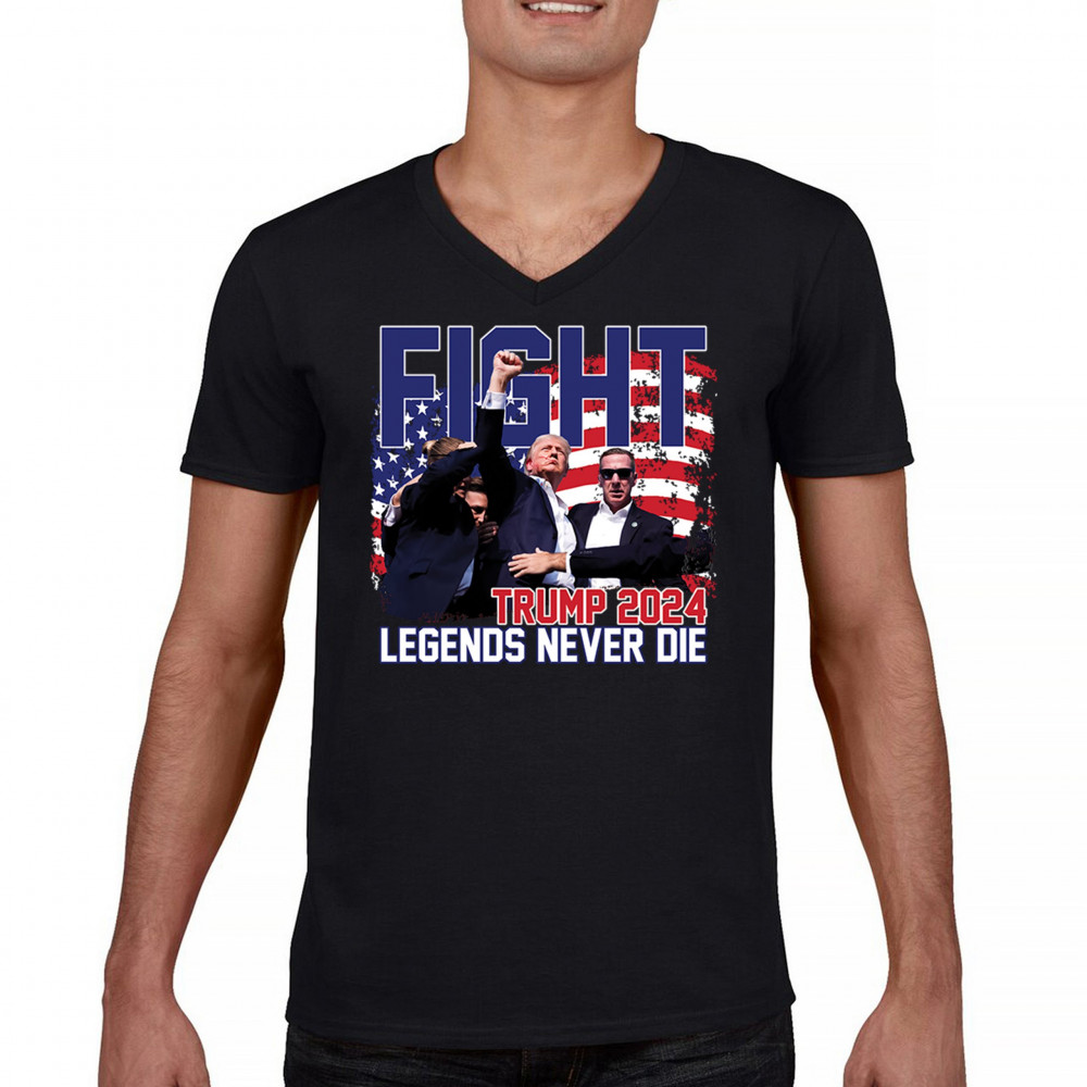 Show your Trump 2024 support with our bold "Fight" design, featuring "Legends Never Die" and a patriotic American flag. Perfect for rallies and everyday wear.