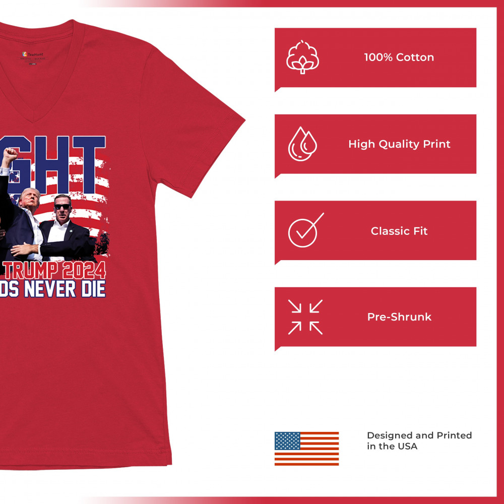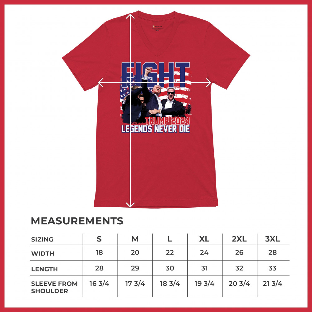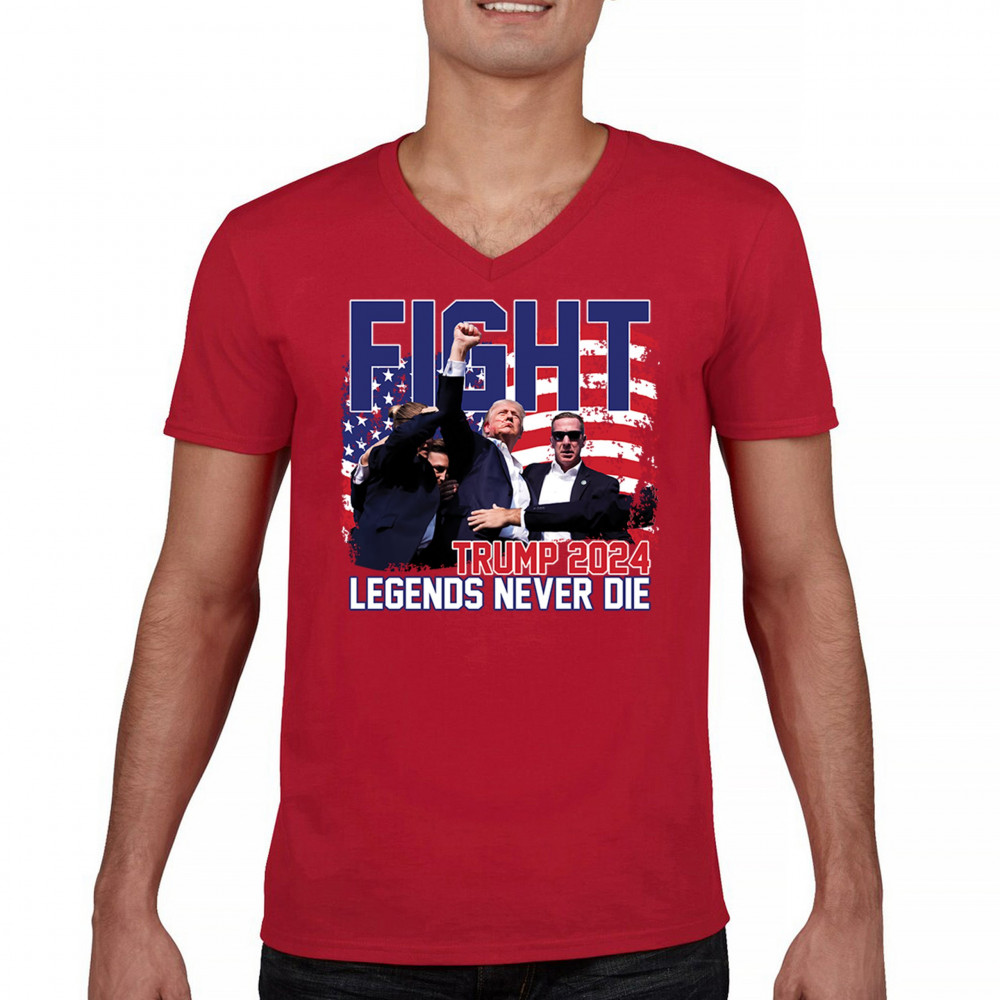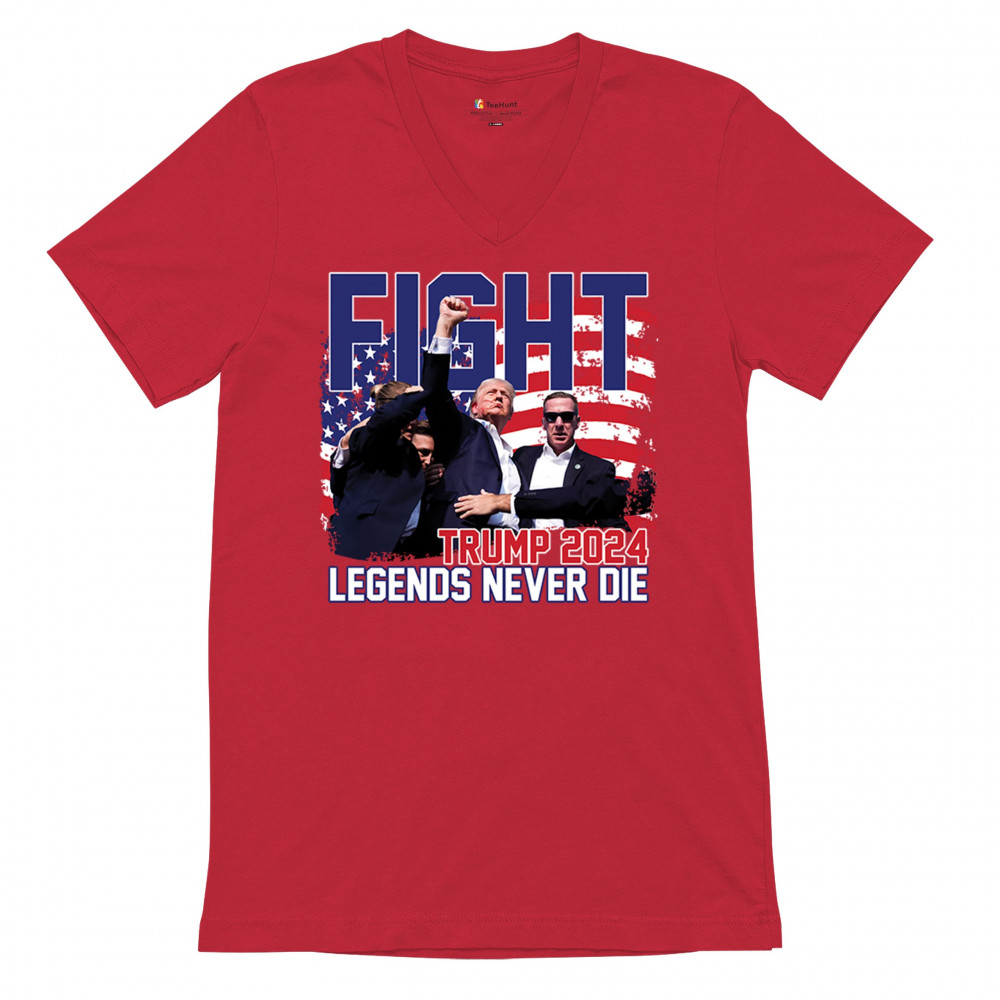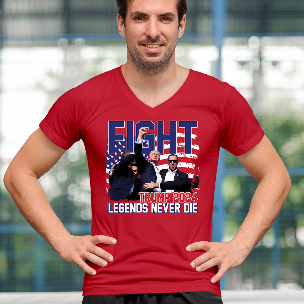 Show your Trump 2024 support with our bold "Fight" design, featuring "Legends Never Die" and a patriotic American flag. Perfect for rallies and everyday wear.
