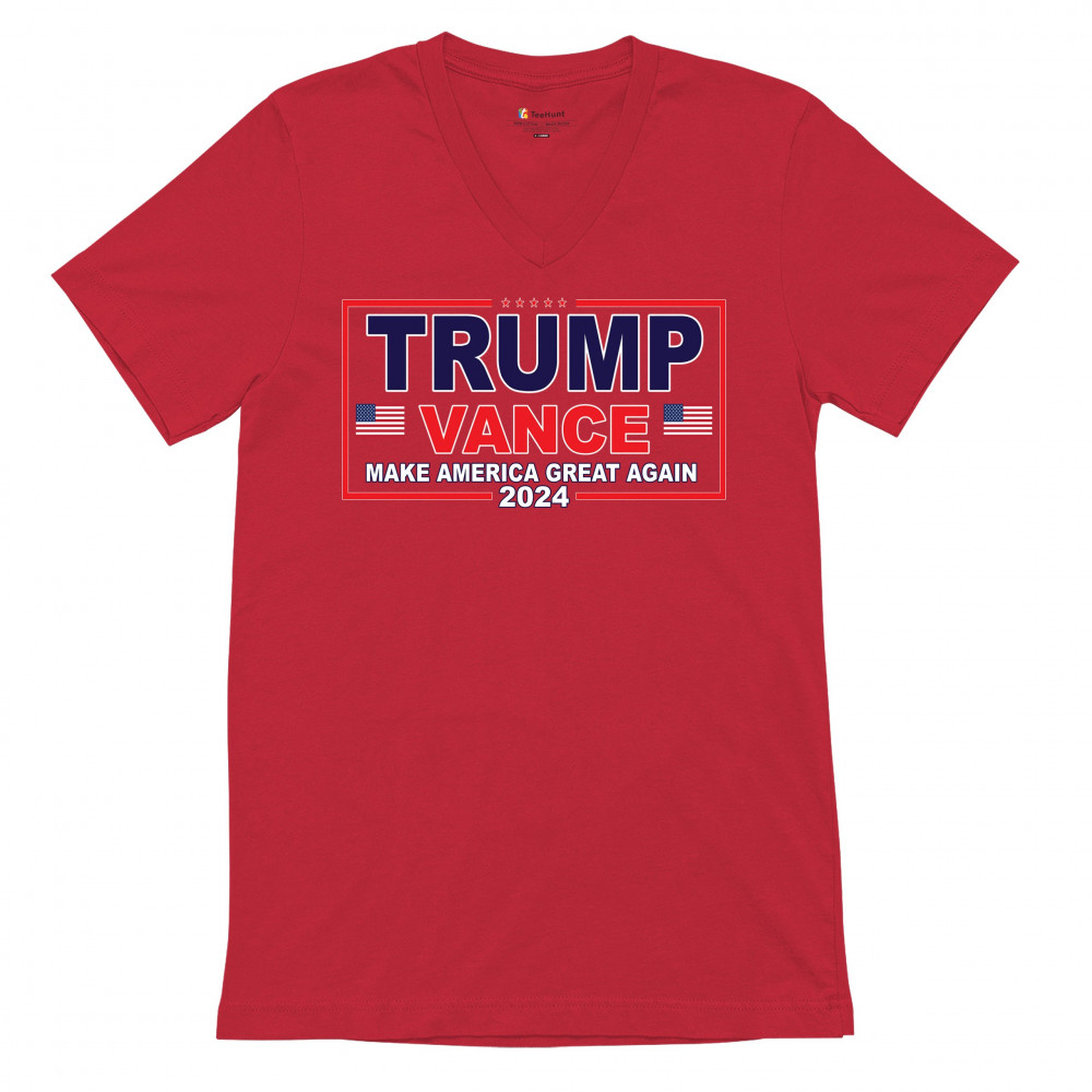 Showcase your support for the Trump-Vance 2024 campaign with this bold patriotic design featuring the American flag and "Make America Great Again" slogan.