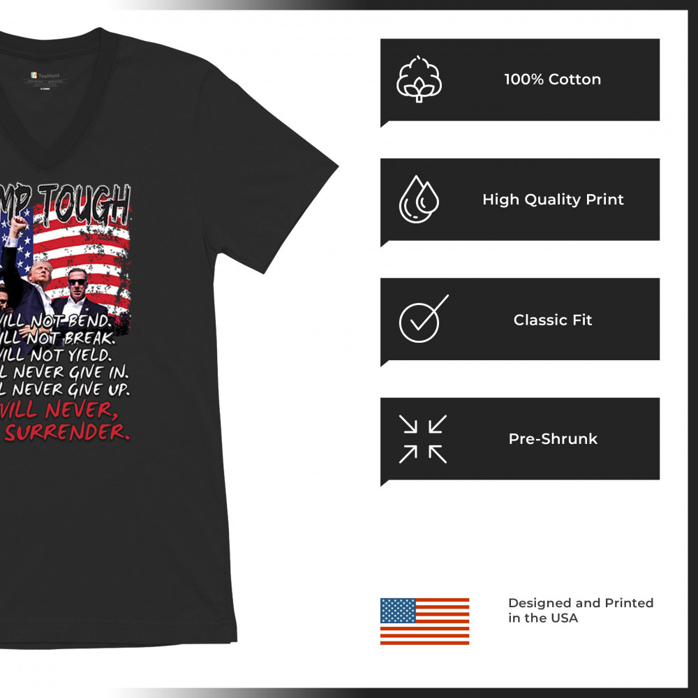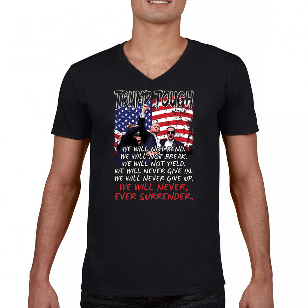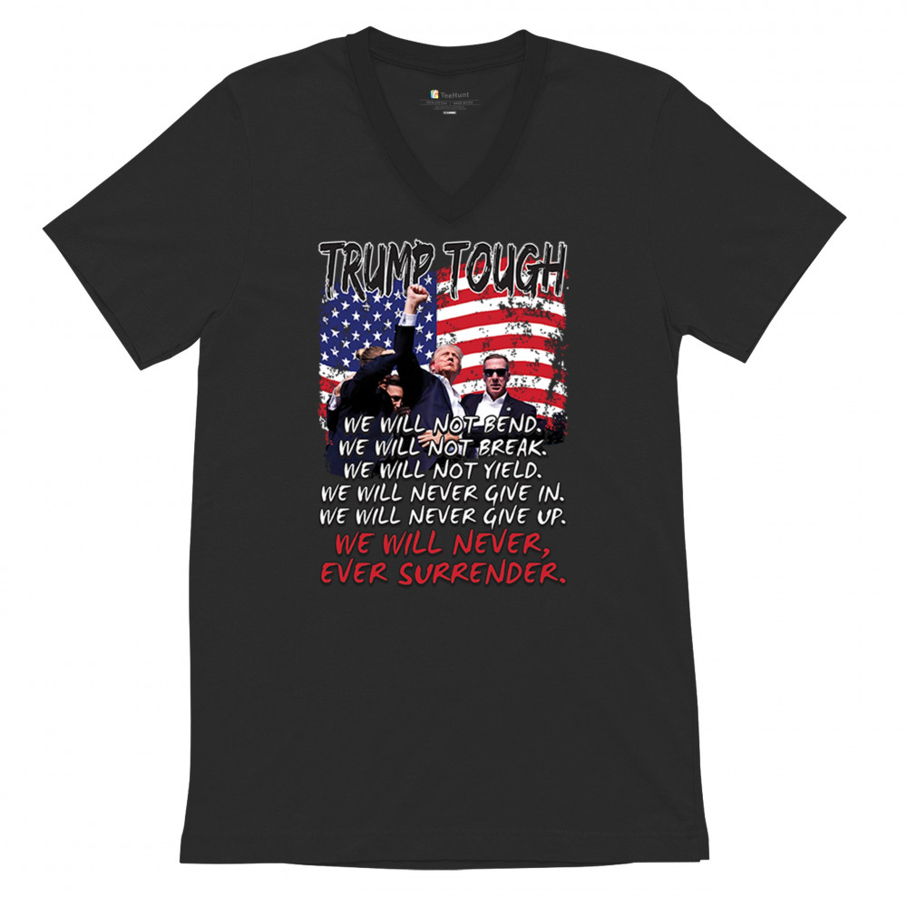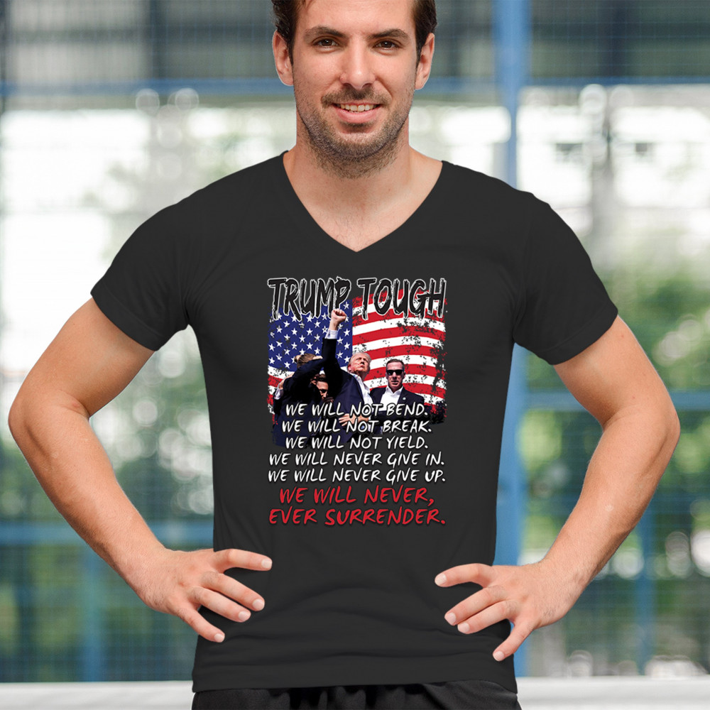 Display your unwavering support for Donald Trump with this powerful design. Crafted for those who believe in conservative values and the America First agenda, it’s perfect for any rally or event. With a striking image and the American flag in the background, this design embodies the spirit of those who refuse to give up or surrender. Show your dedication and pride every time you wear this. Join the movement and stand firm in your beliefs.