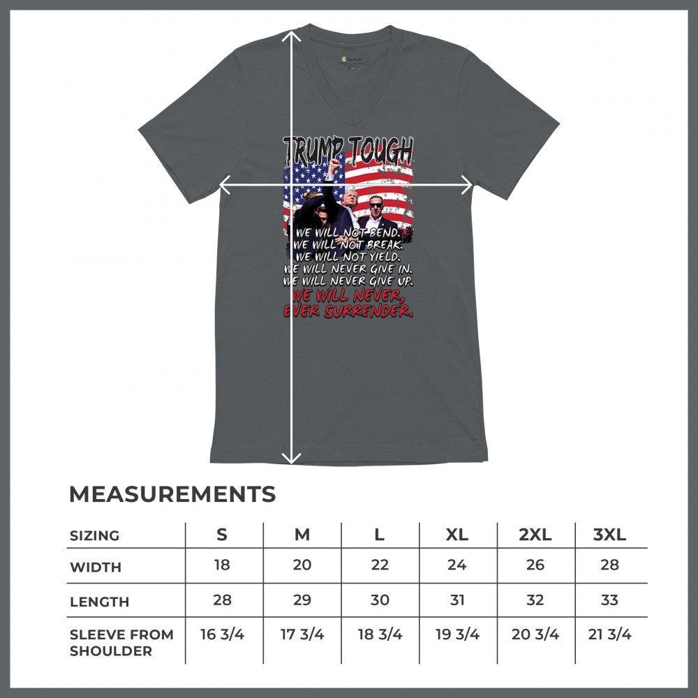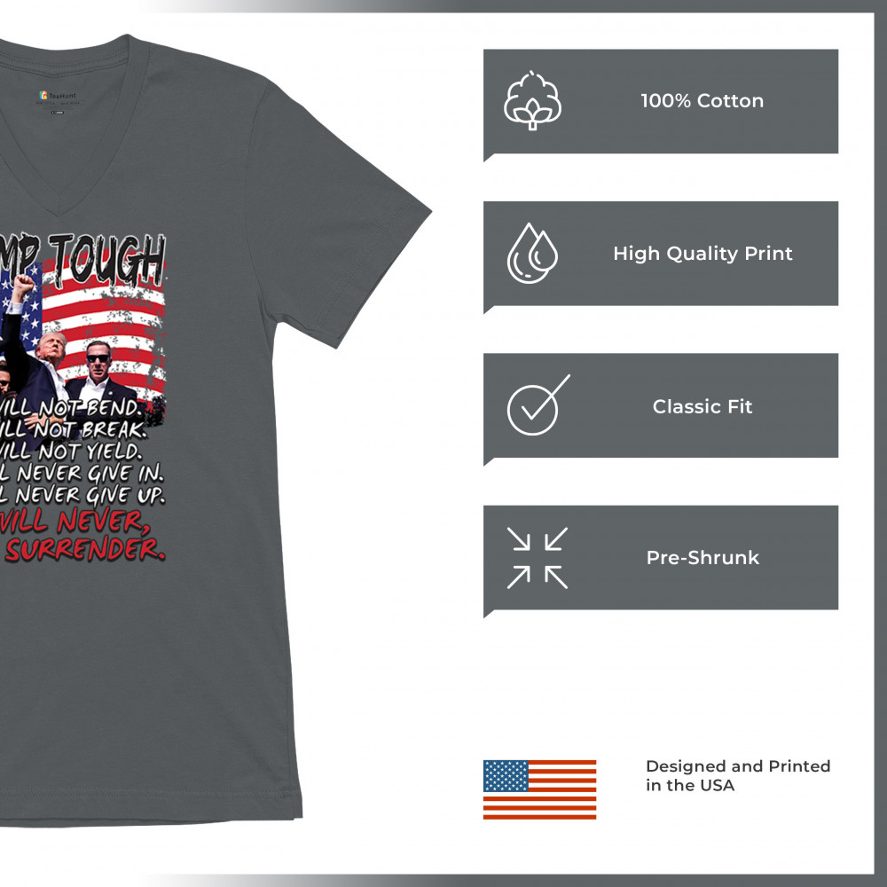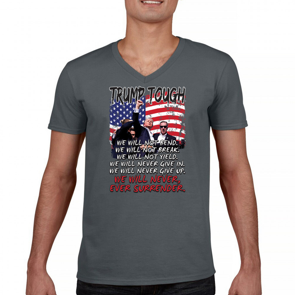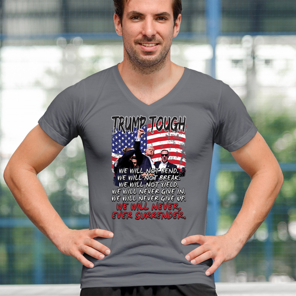 Display your unwavering support for Donald Trump with this powerful design. Crafted for those who believe in conservative values and the America First agenda, it’s perfect for any rally or event. With a striking image and the American flag in the background, this design embodies the spirit of those who refuse to give up or surrender. Show your dedication and pride every time you wear this. Join the movement and stand firm in your beliefs.
