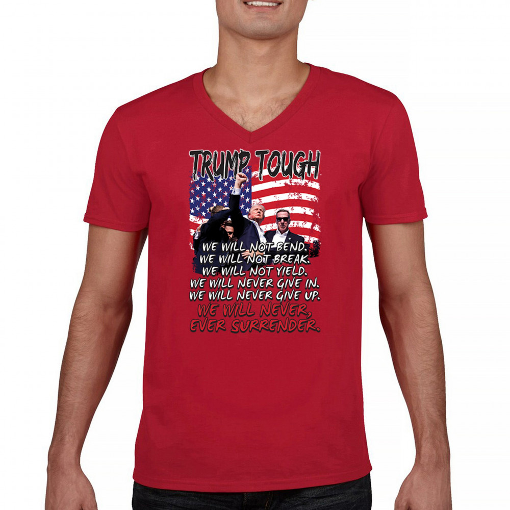 Display your unwavering support for Donald Trump with this powerful design. Crafted for those who believe in conservative values and the America First agenda, it’s perfect for any rally or event. With a striking image and the American flag in the background, this design embodies the spirit of those who refuse to give up or surrender. Show your dedication and pride every time you wear this. Join the movement and stand firm in your beliefs.
