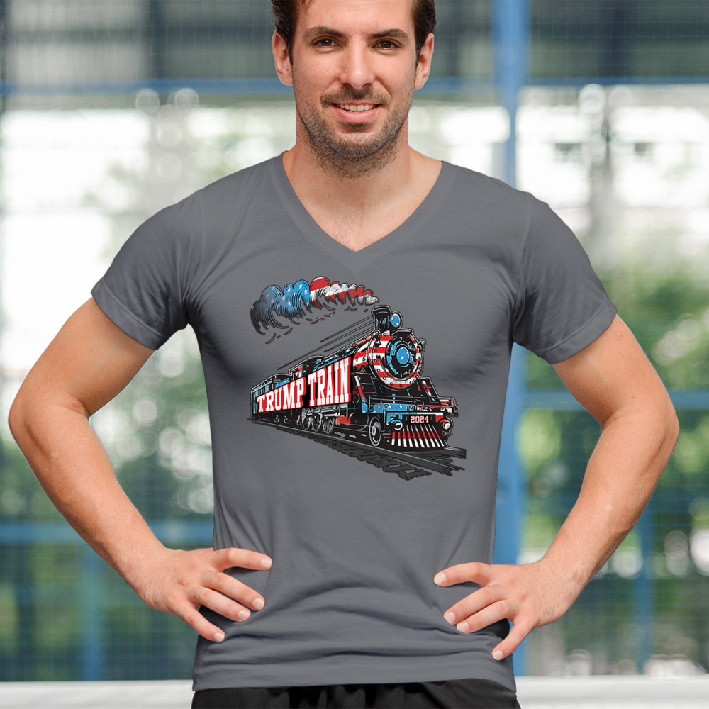 Hop on the Trump Train and support America First! This bold, patriotic tee is perfect for Republicans, conservatives, and the Red Wave movement.