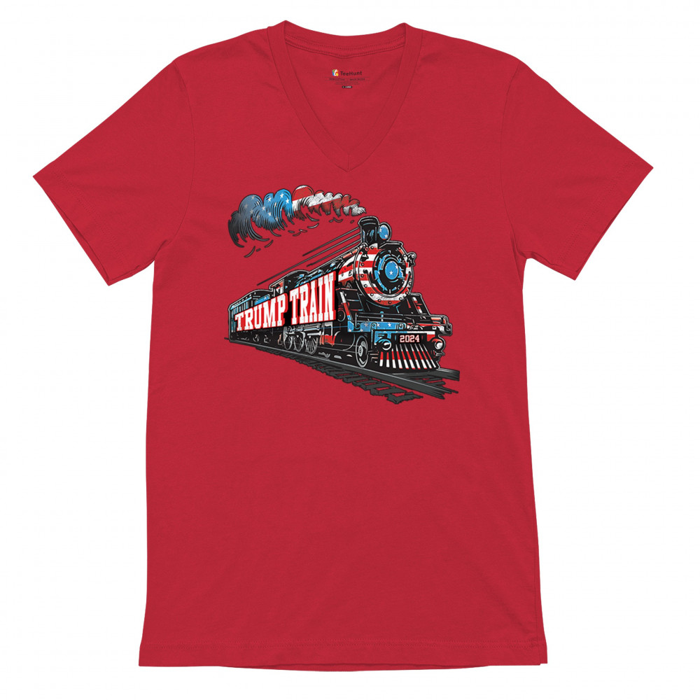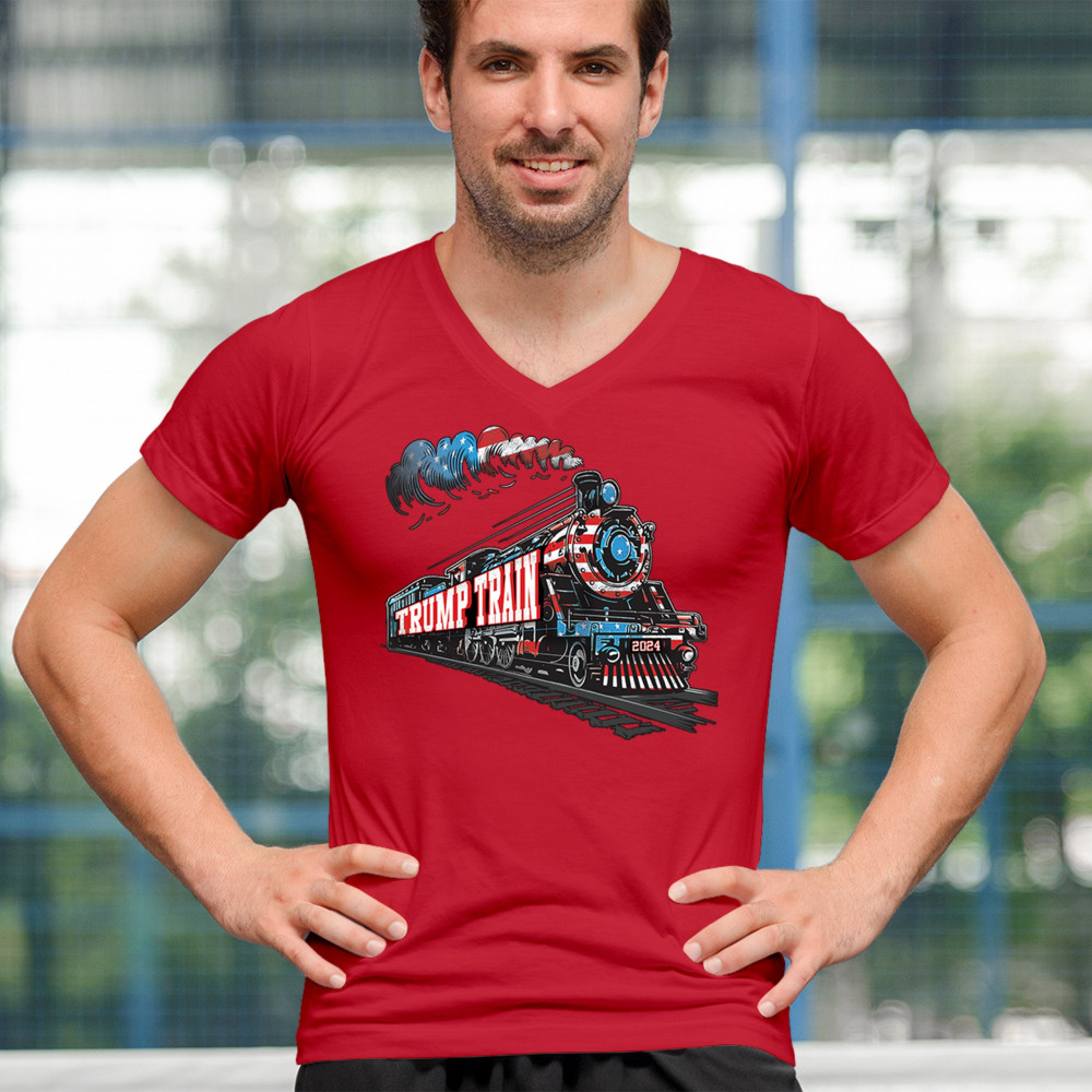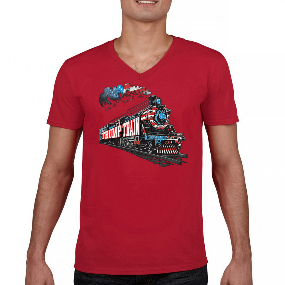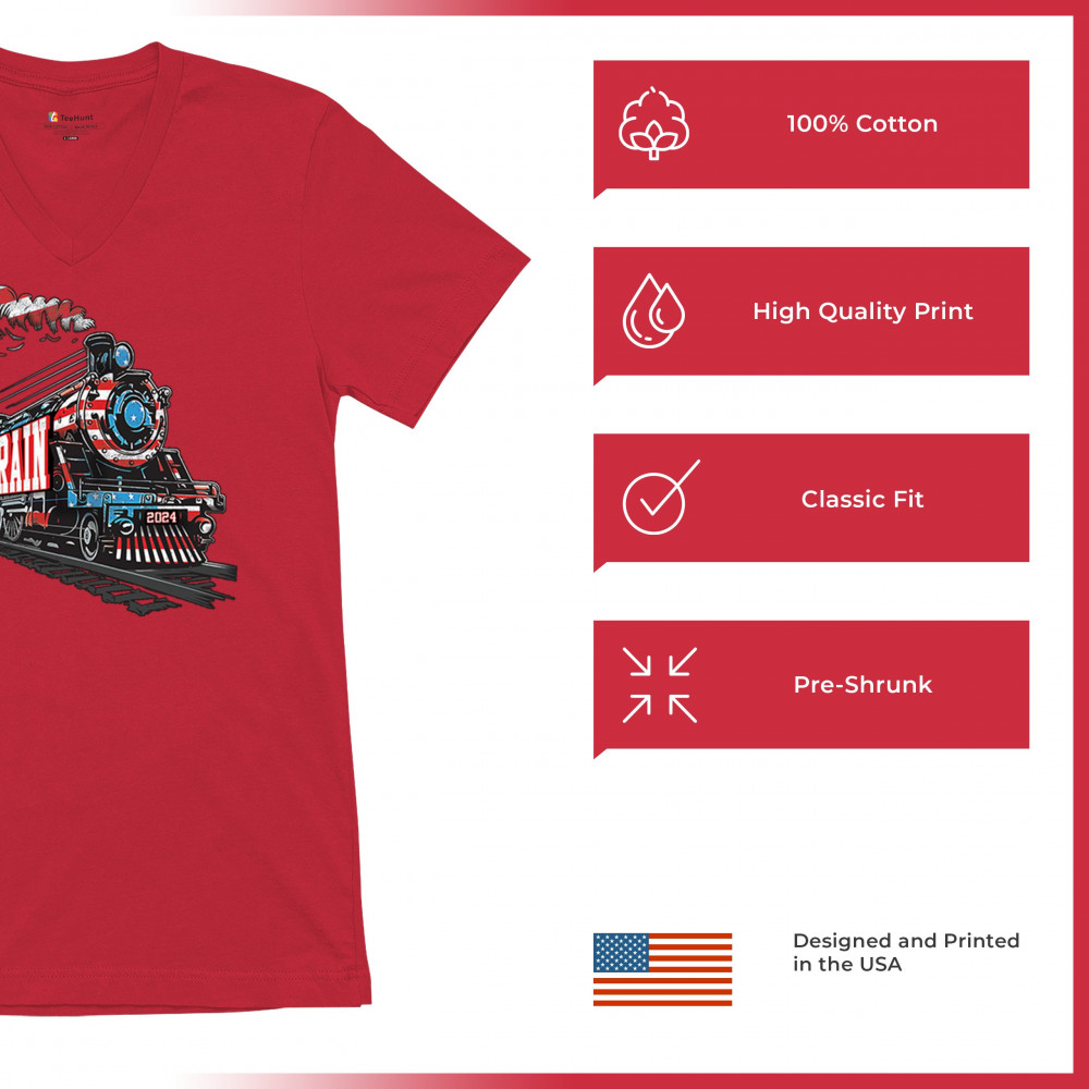 Hop on the Trump Train and support America First! This bold, patriotic tee is perfect for Republicans, conservatives, and the Red Wave movement.