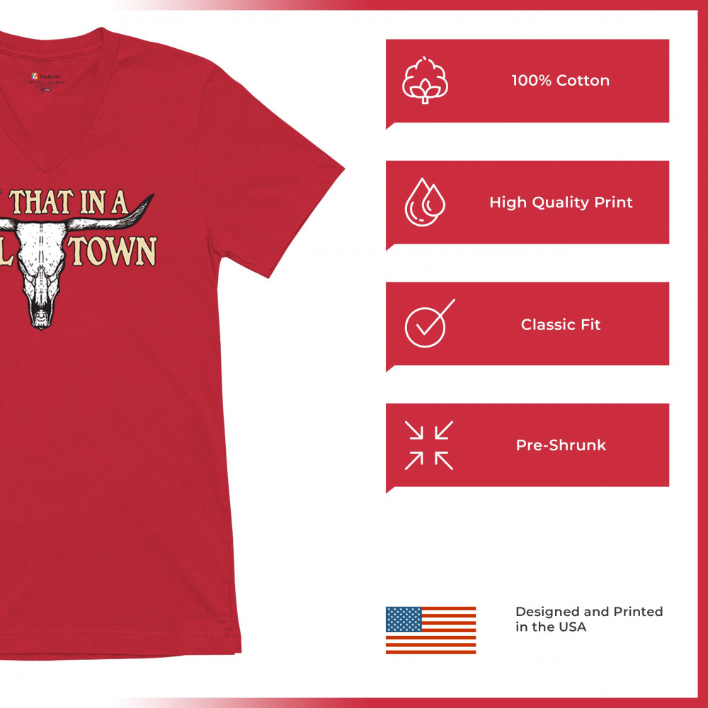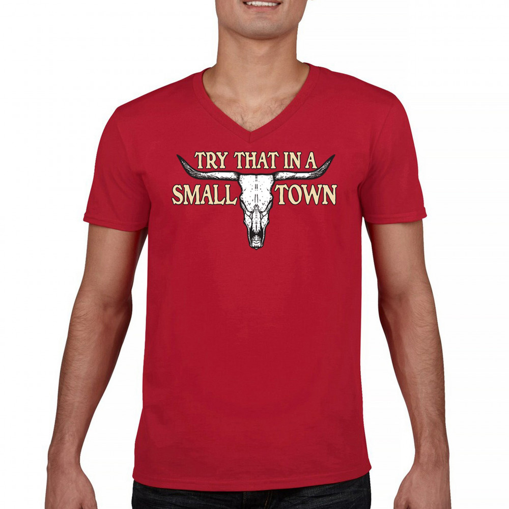 This design boldly proclaims "Try That in a SMALL TOWN," set against the backdrop of a stark cattle skull—a symbol deeply rooted in southern heritage and the undying American spirit. It's a tribute to the small-town sheriffs, the unwritten laws of backbone and duty, and the patriotic fervor that runs through the country's veins. Whether you're a motorcycle enthusiast, a Republican, or simply a connoisseur of all things vintage, this piece is a testament to enduring strength and local pride.