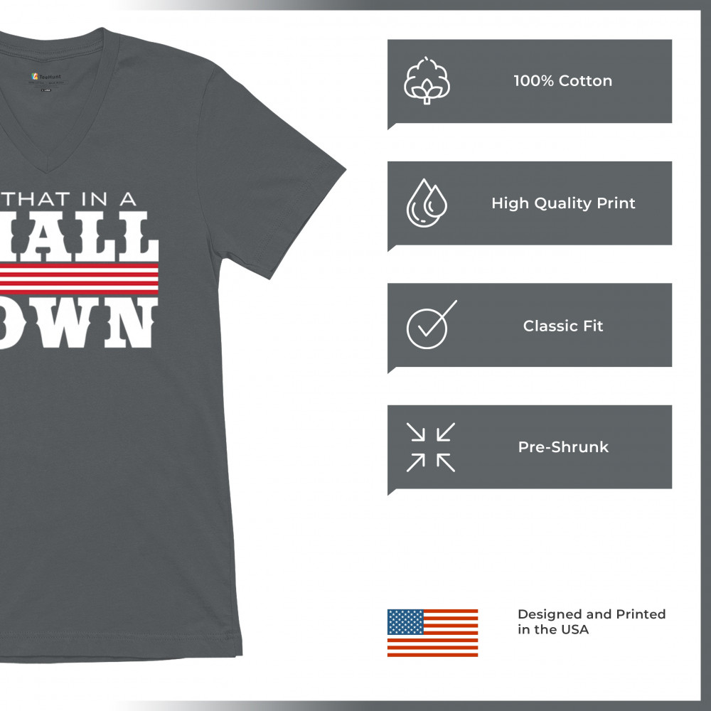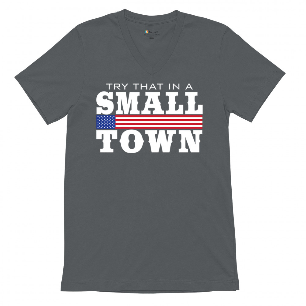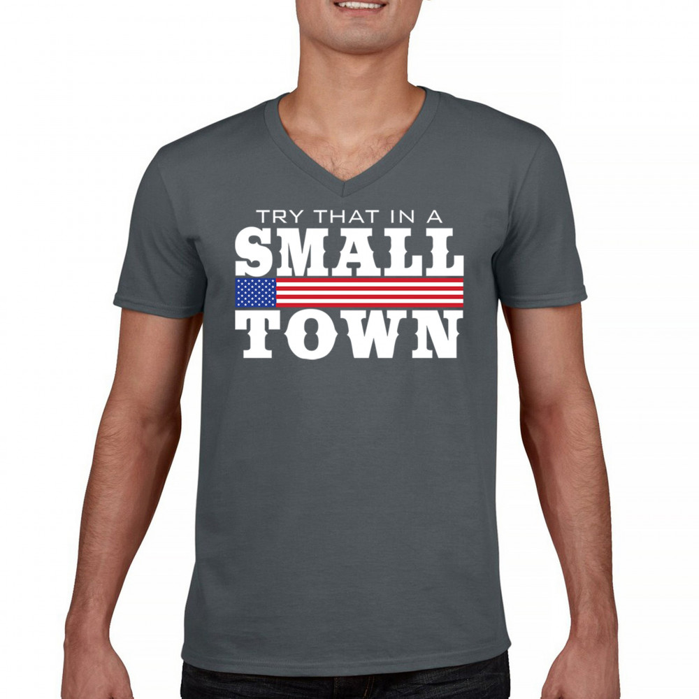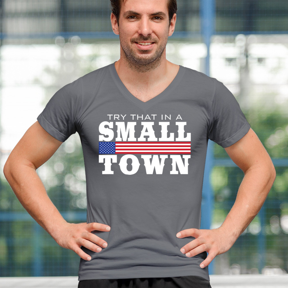 Celebrate small-town pride with our "Try That In A Small Town" design. Perfect for patriotic events, it features a bold American flag graphic.