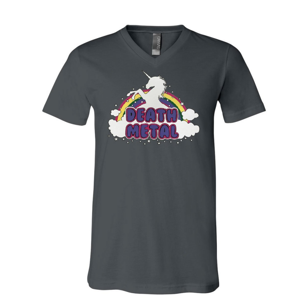UNICORN DEATH METAL v-neck t-shirt rainbow hilarious cute heavy music tee charcoal