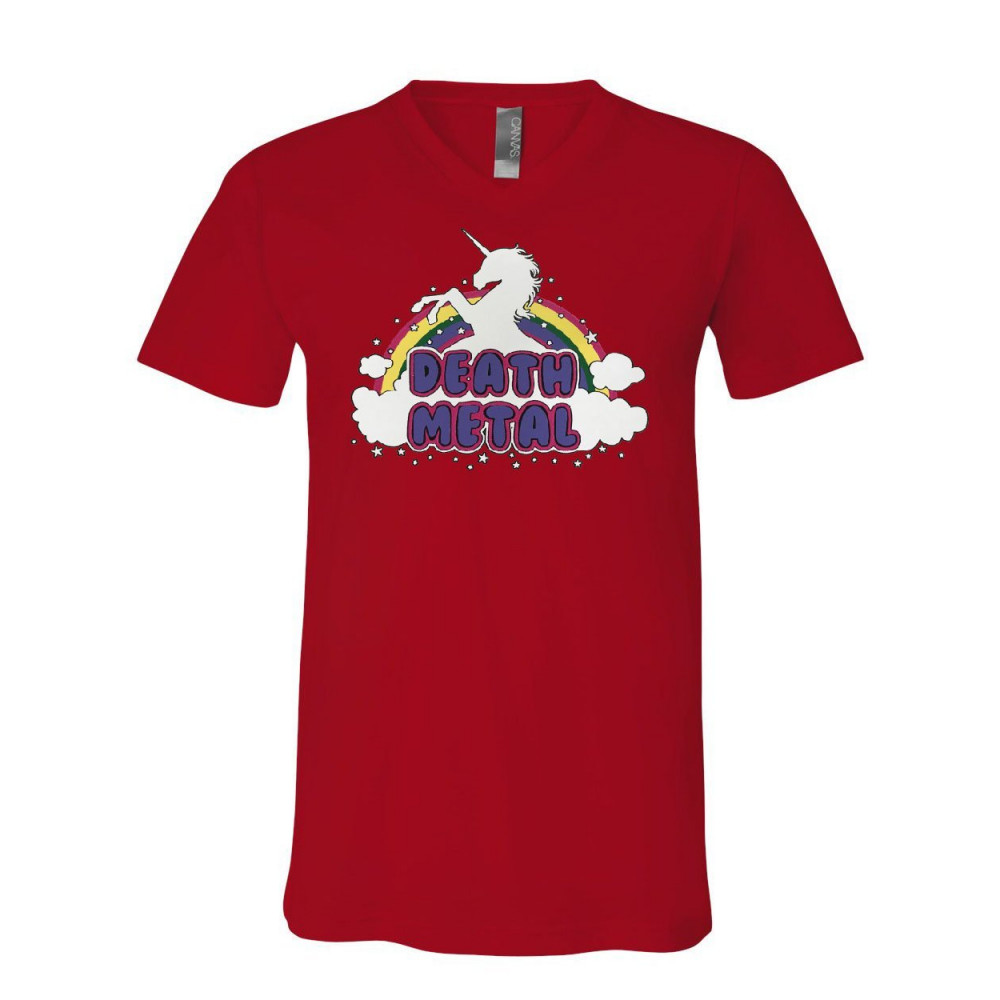 UNICORN DEATH METAL v-neck t-shirt rainbow hilarious cute heavy music tee red