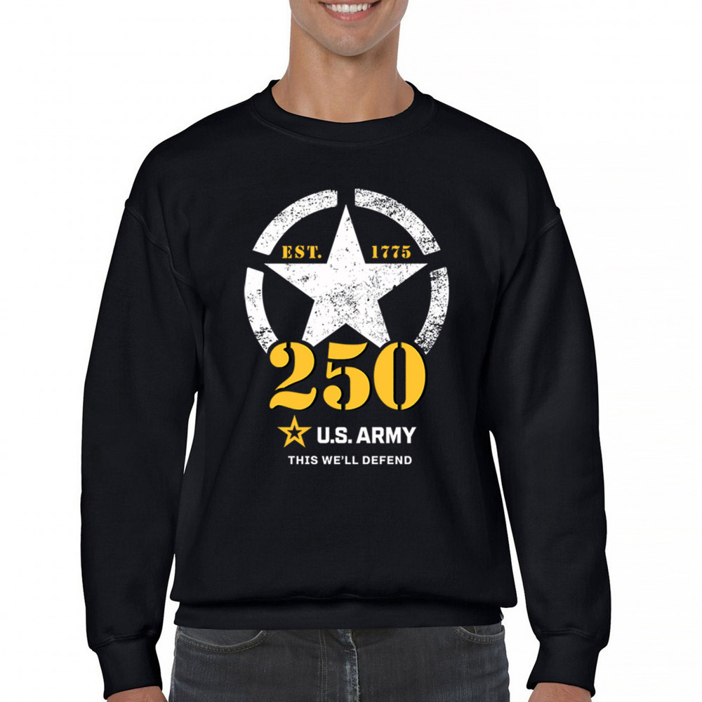 Boldly marking the U.S. Army’s 250th anniversary, this design includes a distressed white star, 1775 EST detail, and bold yellow “250” typeface beneath the iconic motto “This We’ll Defend.” A fitting tribute for veterans, service members, and families who want to show respect and pride during military observances or patriotic events.
