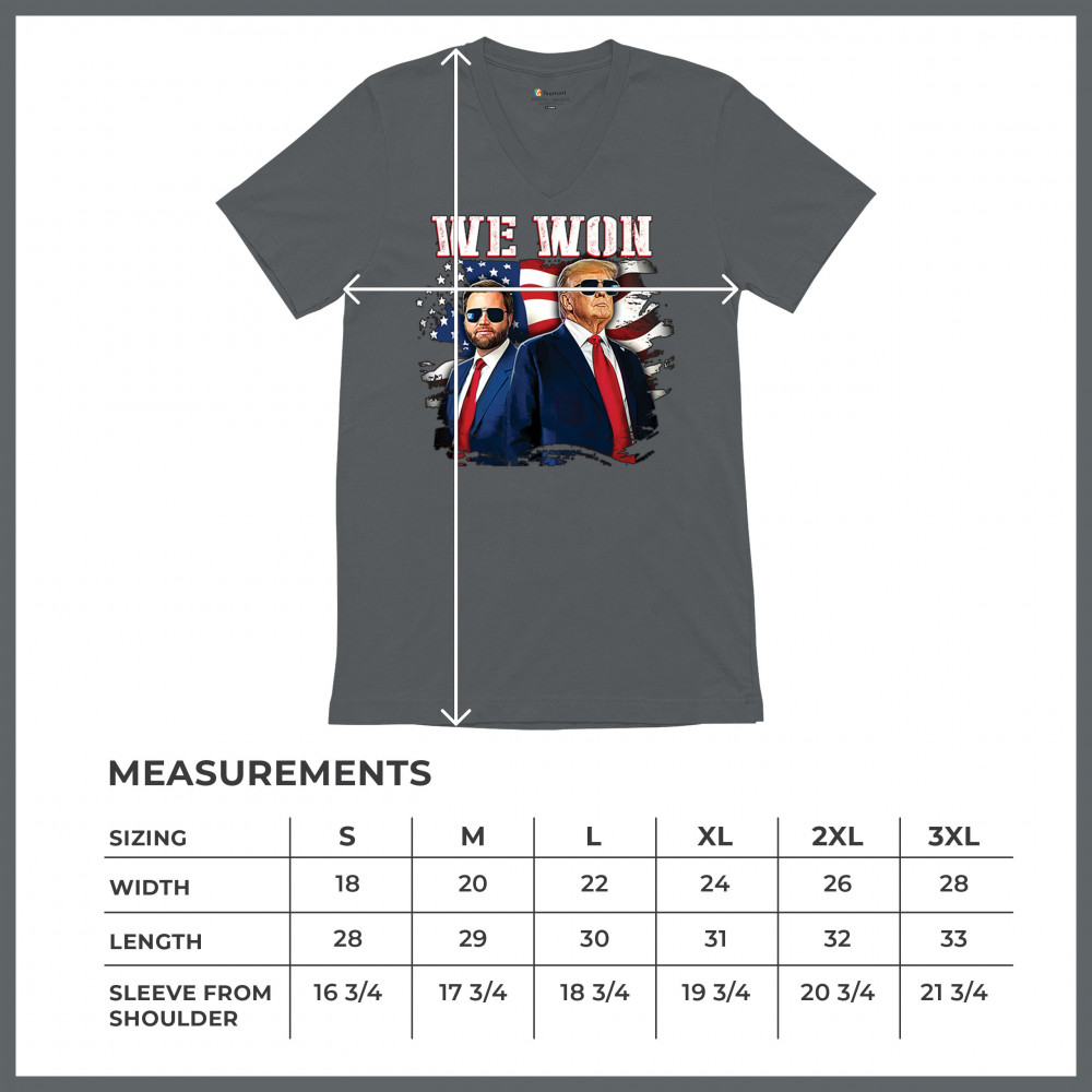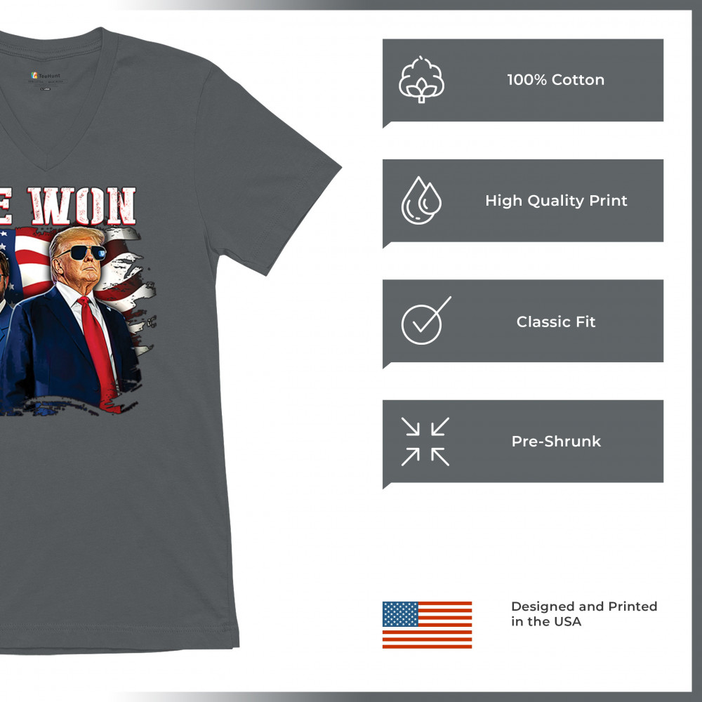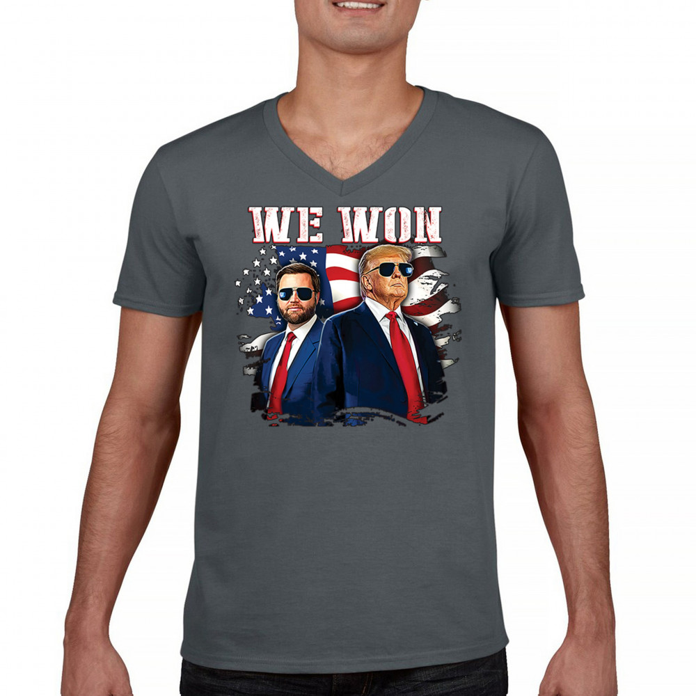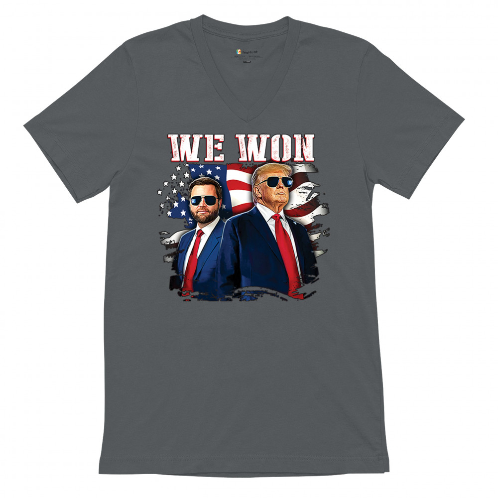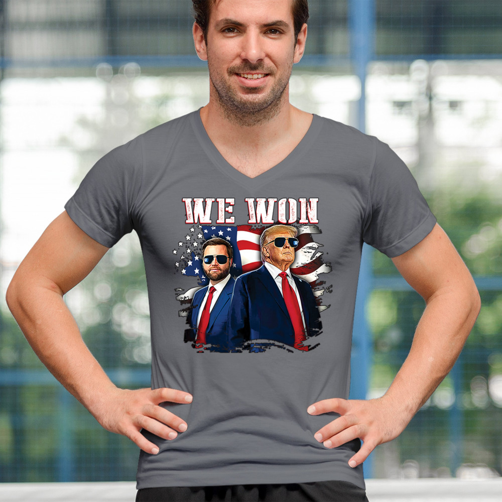 Celebrate Republican victory with this bold "We Won" design featuring Trump and patriotic flair—perfect for rallies, events, and patriotic pride.