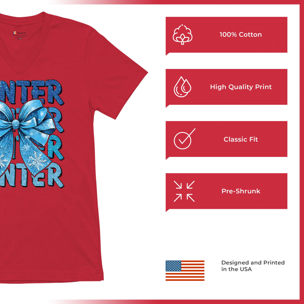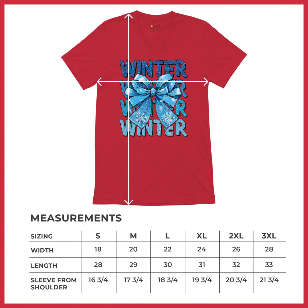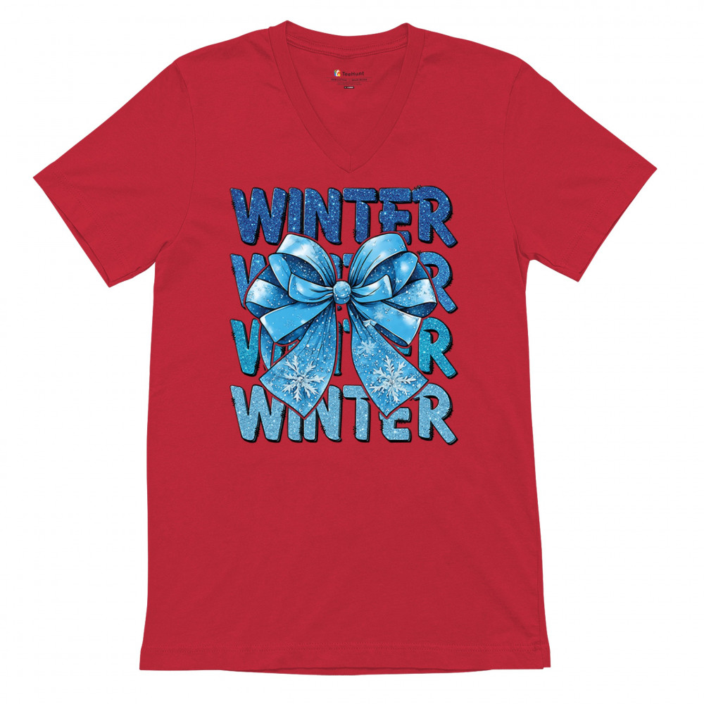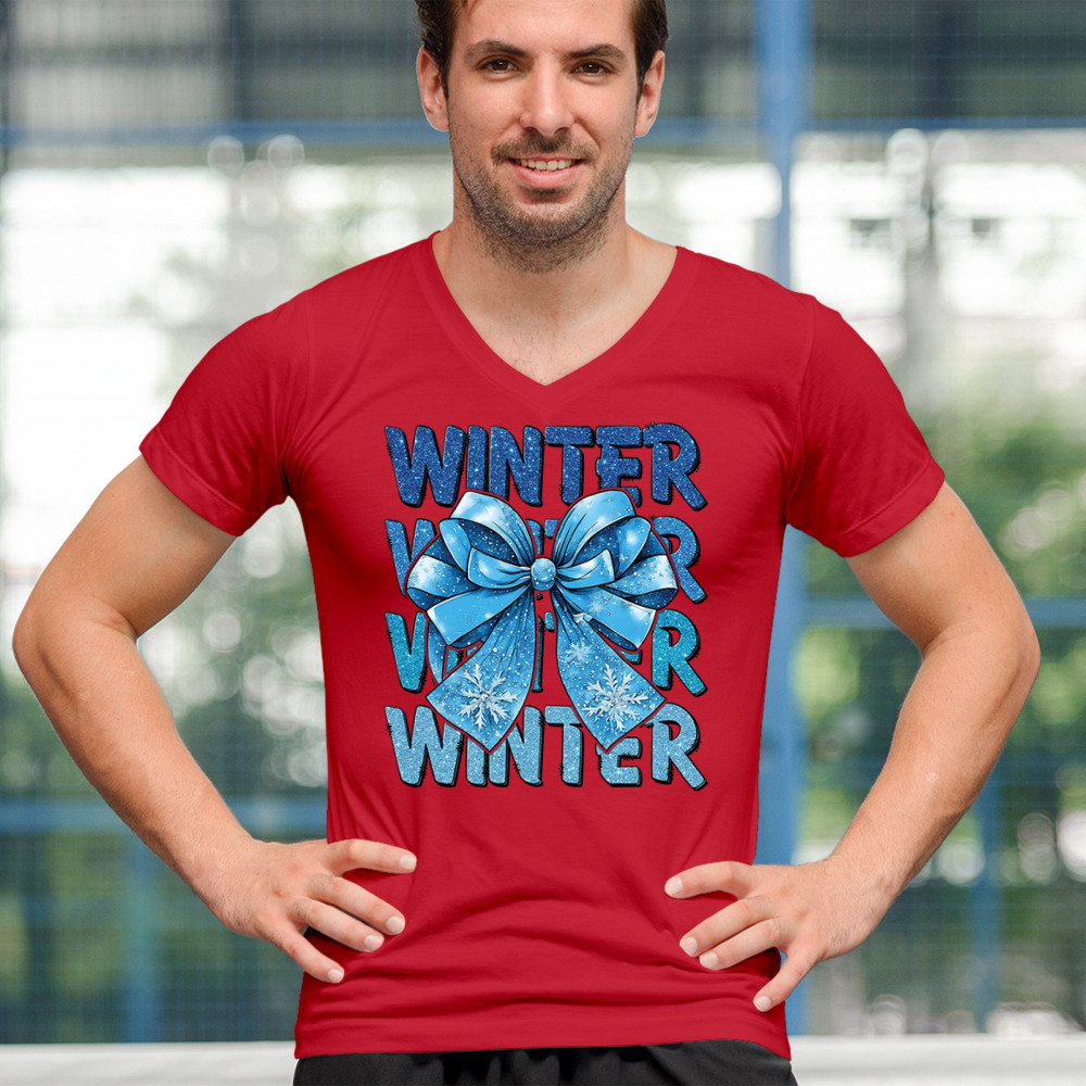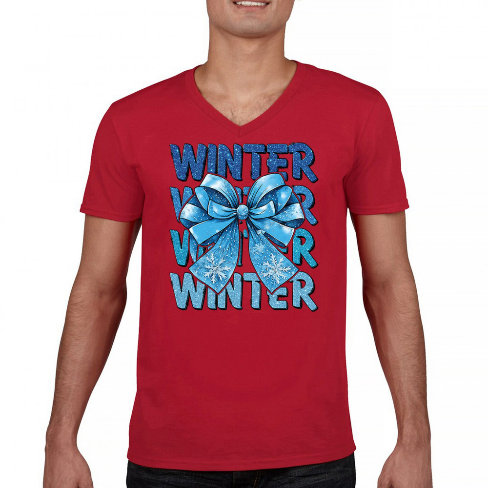 This shimmering winter bow design blends icy blue glitter style with bold repeating WINTER text for a bright seasonal statement. Snowflake accents and frosty tones create a cozy, cheerful vibe perfect for holiday outfits, gifting, or cold-weather lovers. A standout graphic that brings festive winter charm to any wardrobe and boosts seasonal search visibility.