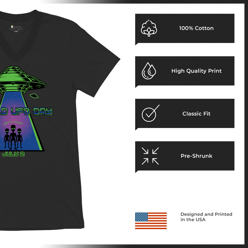 WORLD UFO DAY GET IN LOSER v-neck t-shirt funny aliens flying saucer space tee black