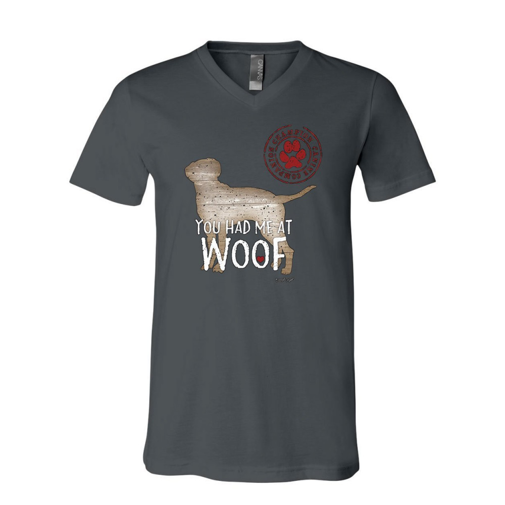 YOU HAD ME AT WOOF v-neck t-shirt pet friend dogs doggie puppy paw bark tee charcoal