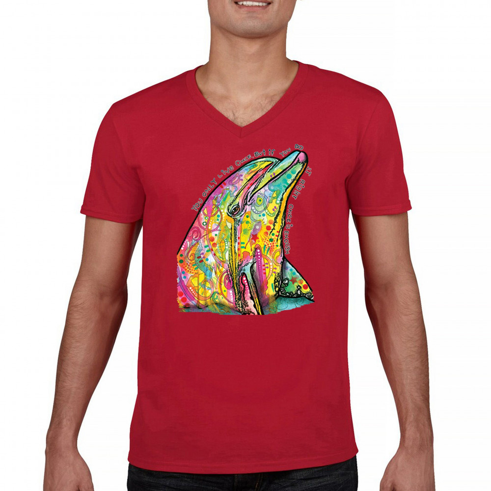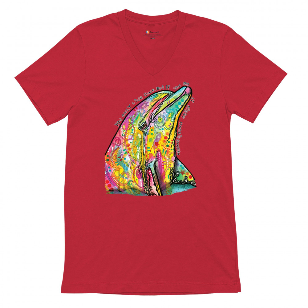 YOU ONLY LIVE ONCE v-neck t-shirt cute neon dolphin dean russo yolo tee red