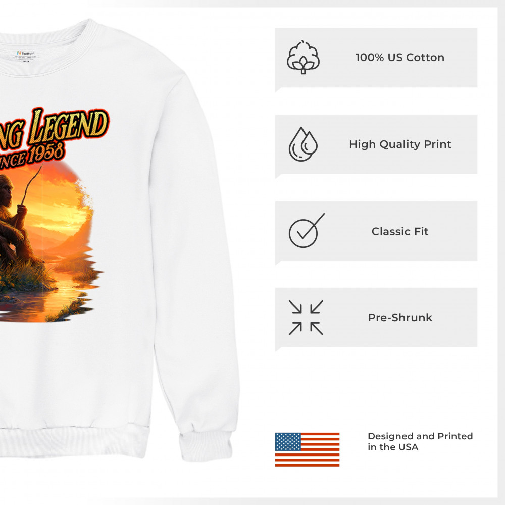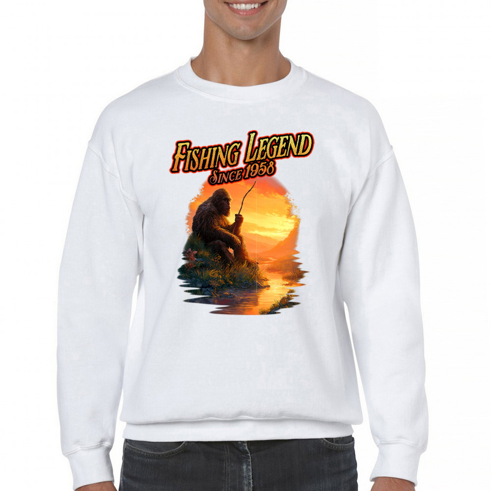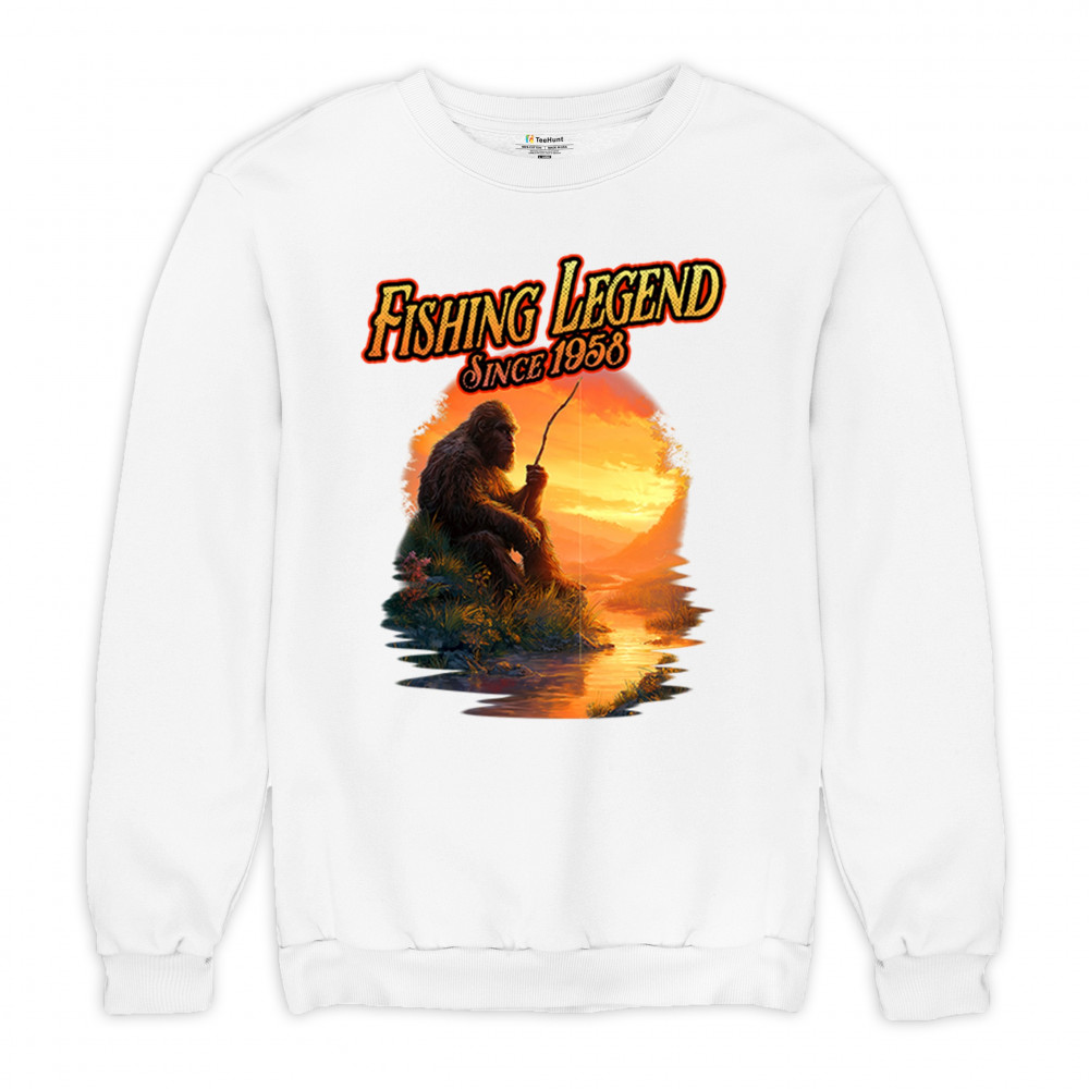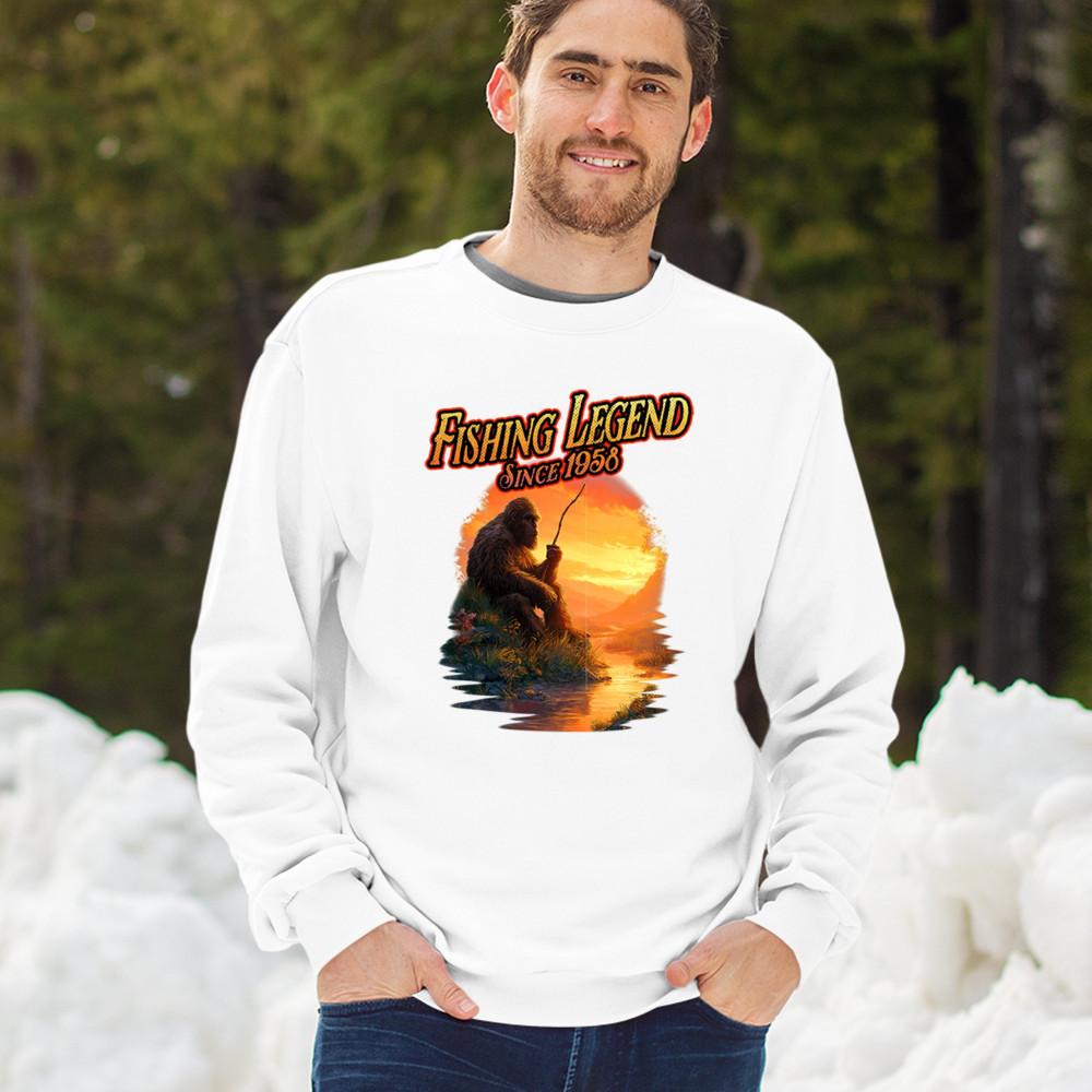 Bigfoot fishing legend design with Sasquatch lifestyle, retro vintage humor, funny wilderness shirt, Father’s Day gift, and campfire style.
