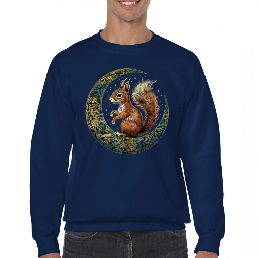 Red squirrel in green-gold Celtic crescent moon with cosmic sky. Symbolizes agility, planning, and mystical forest energy in a fantasy design.