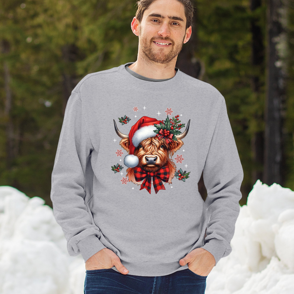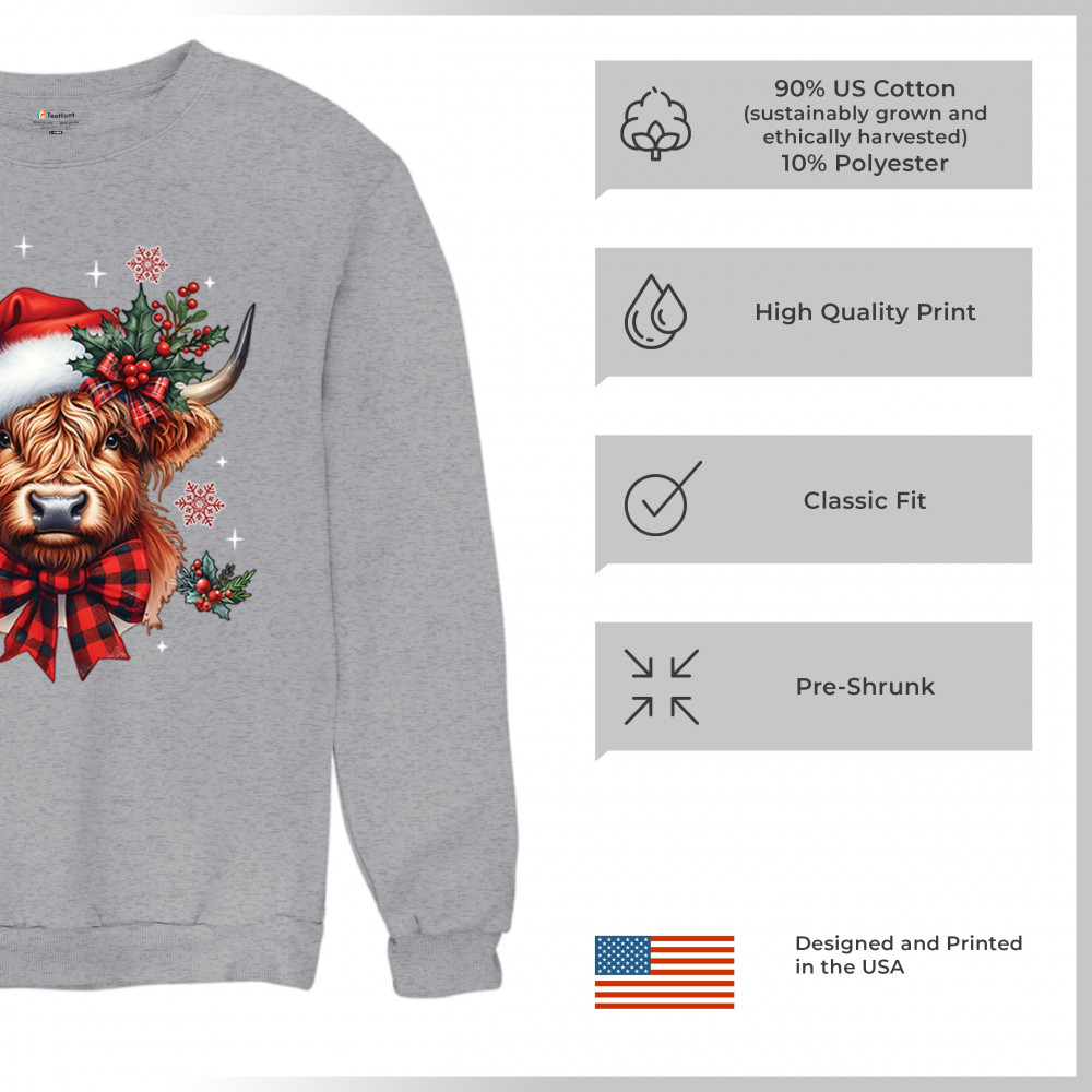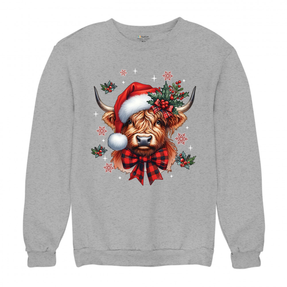 Festive Highland cow Christmas design with Santa hat, plaid bow, holly, and rustic farmhouse holiday charm. Perfect for cozy winter decor.