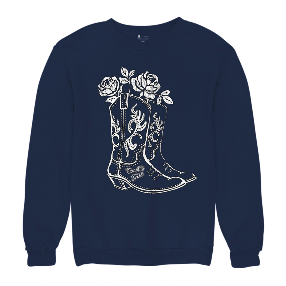 Rustic country girl design with boots and roses. Vintage western art perfect for cowgirls, rodeos, fairs, and outdoor country events.