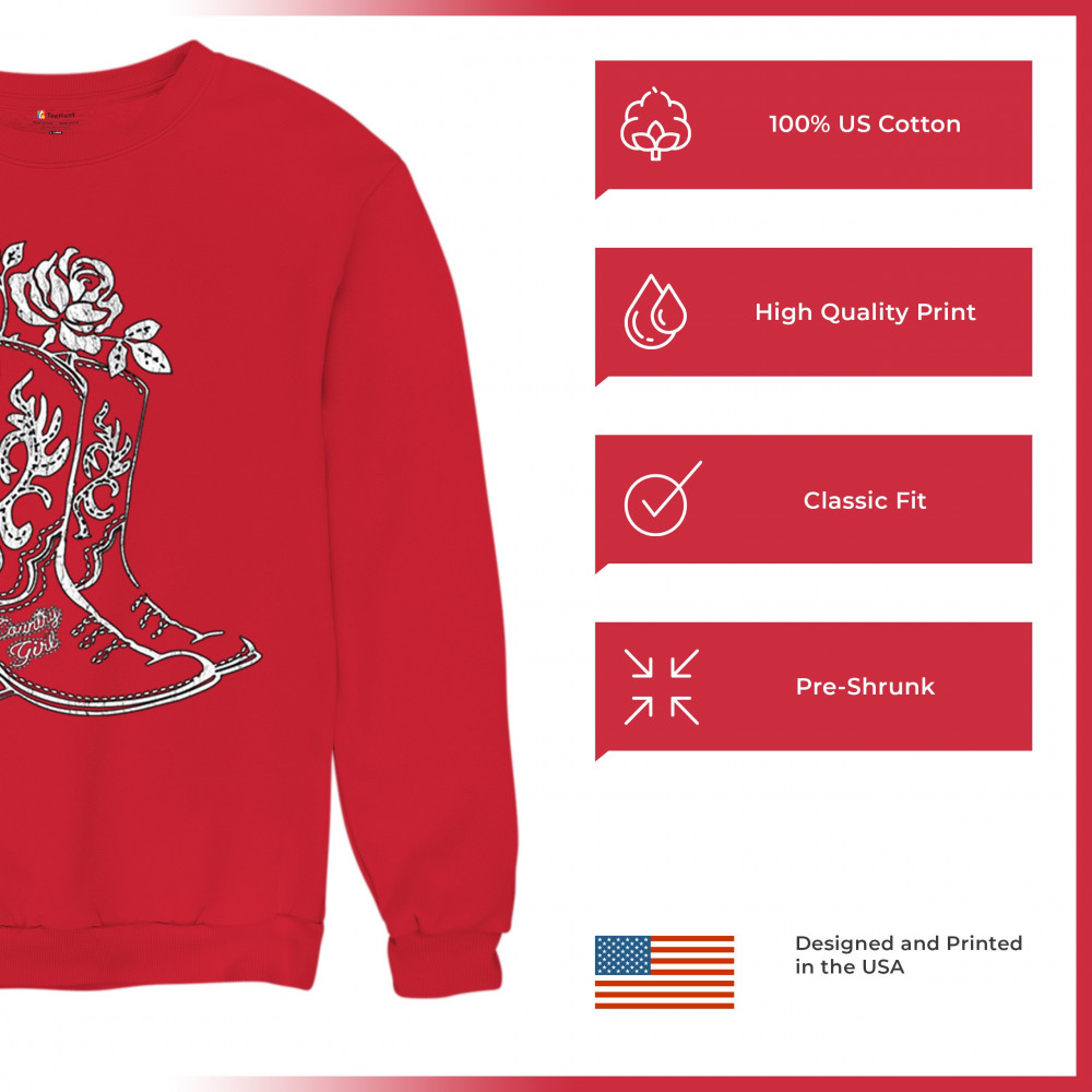 Rustic country girl design with boots and roses. Vintage western art perfect for cowgirls, rodeos, fairs, and outdoor country events.