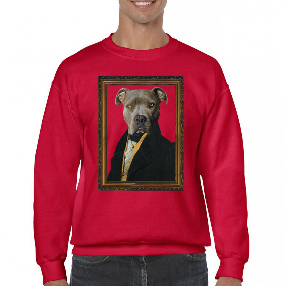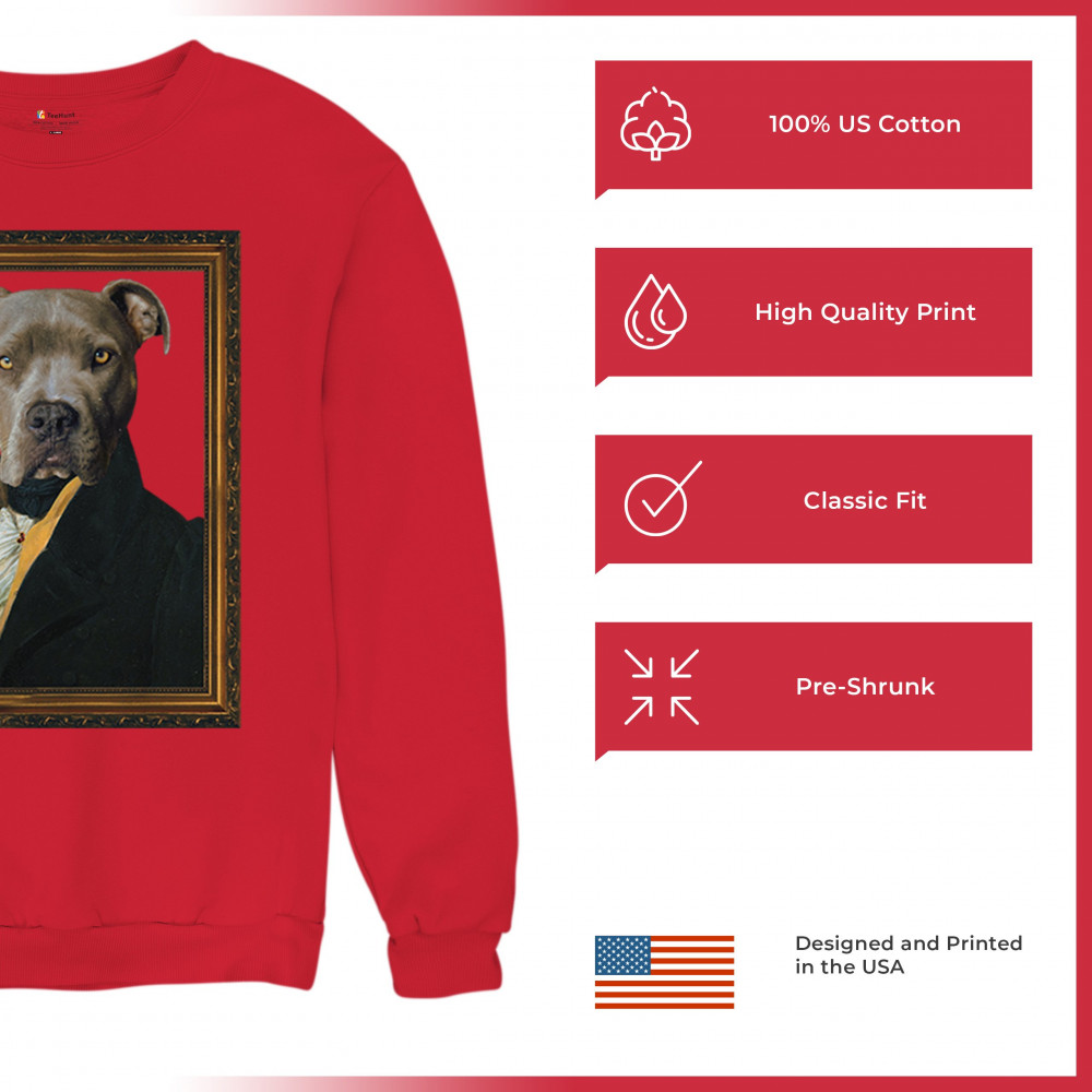 Unique pit bull portrait in 18th-century attire, blending humor and elegance for pet lovers and history enthusiasts. Perfect for home or office decor.