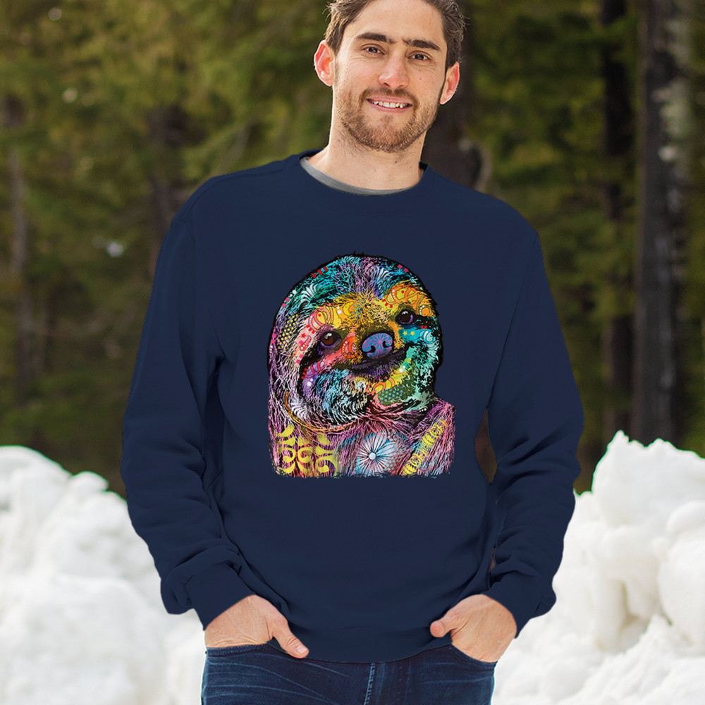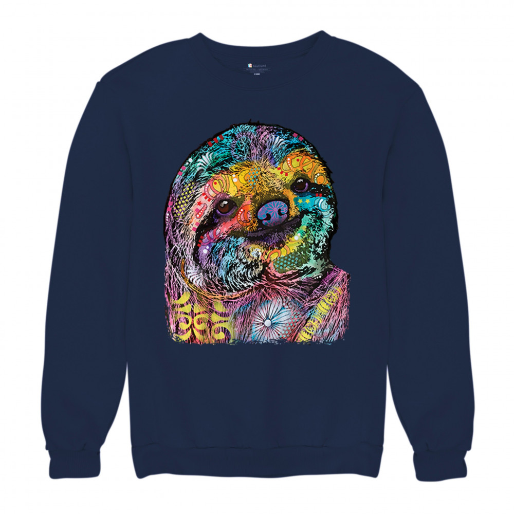 DEAN RUSSO CUTE LAZY SLOTH sweatshirt funny wild life colorful crewneck navy blue