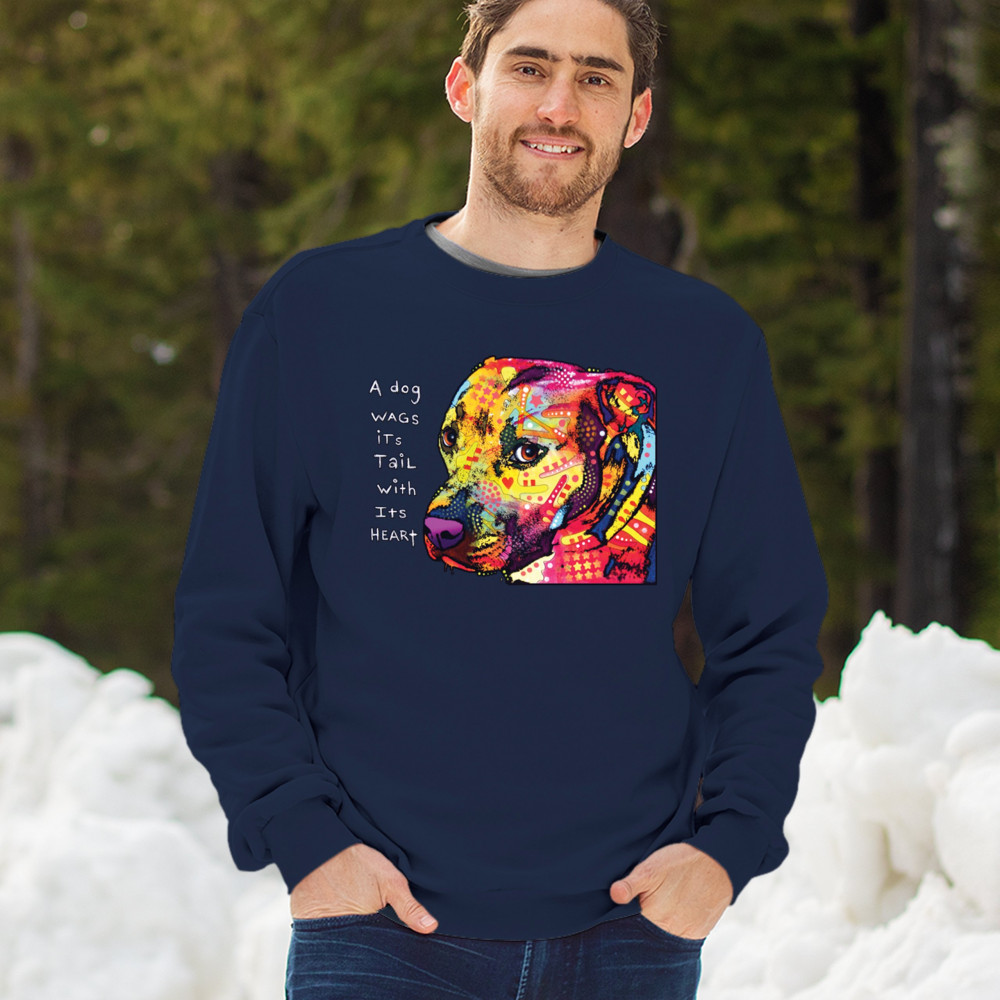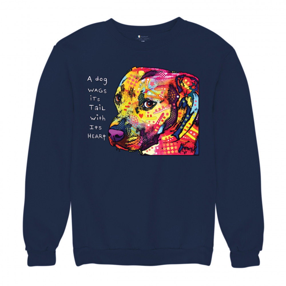 DEAN RUSSO PIT BULL sweatshirt dog wags its tail with its heart crewneck navy blue