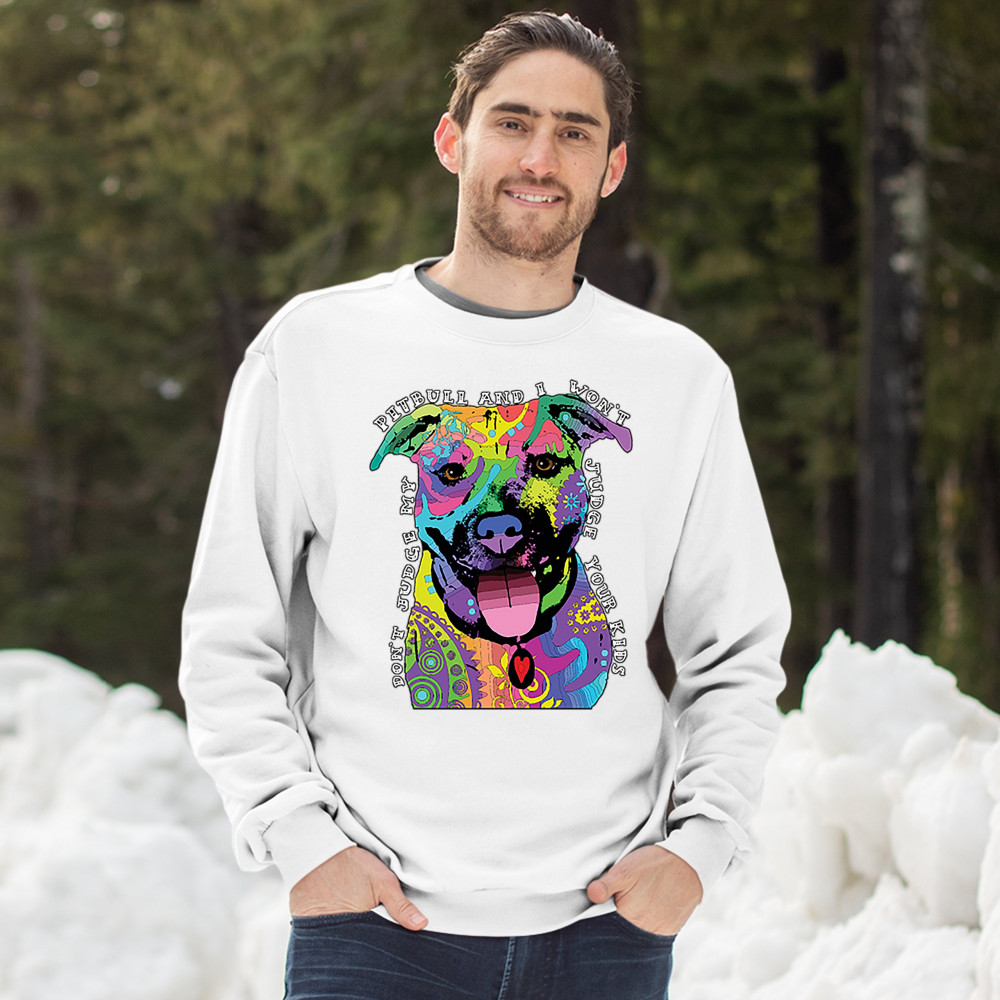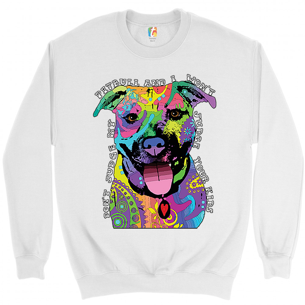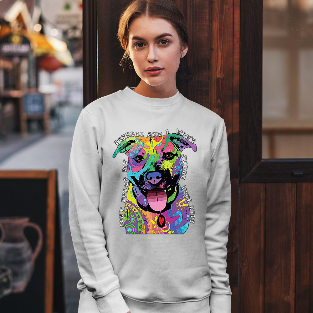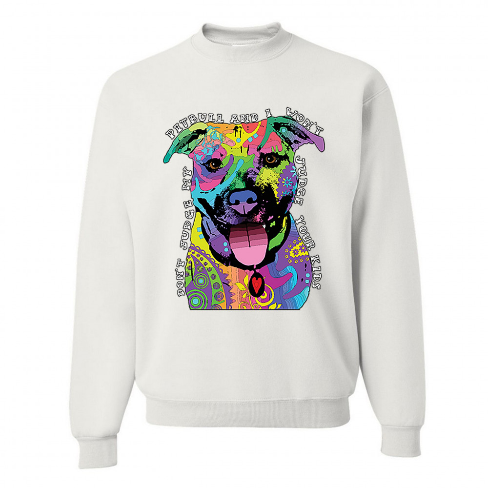DON'T JUDGE MY PIT BULL sweatshirt funny andy maxx dog lover pet owner crewneck white