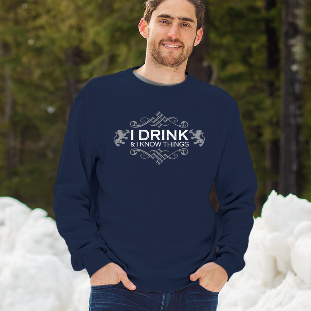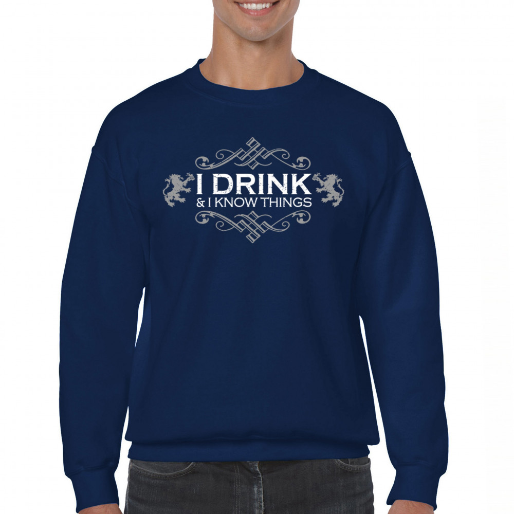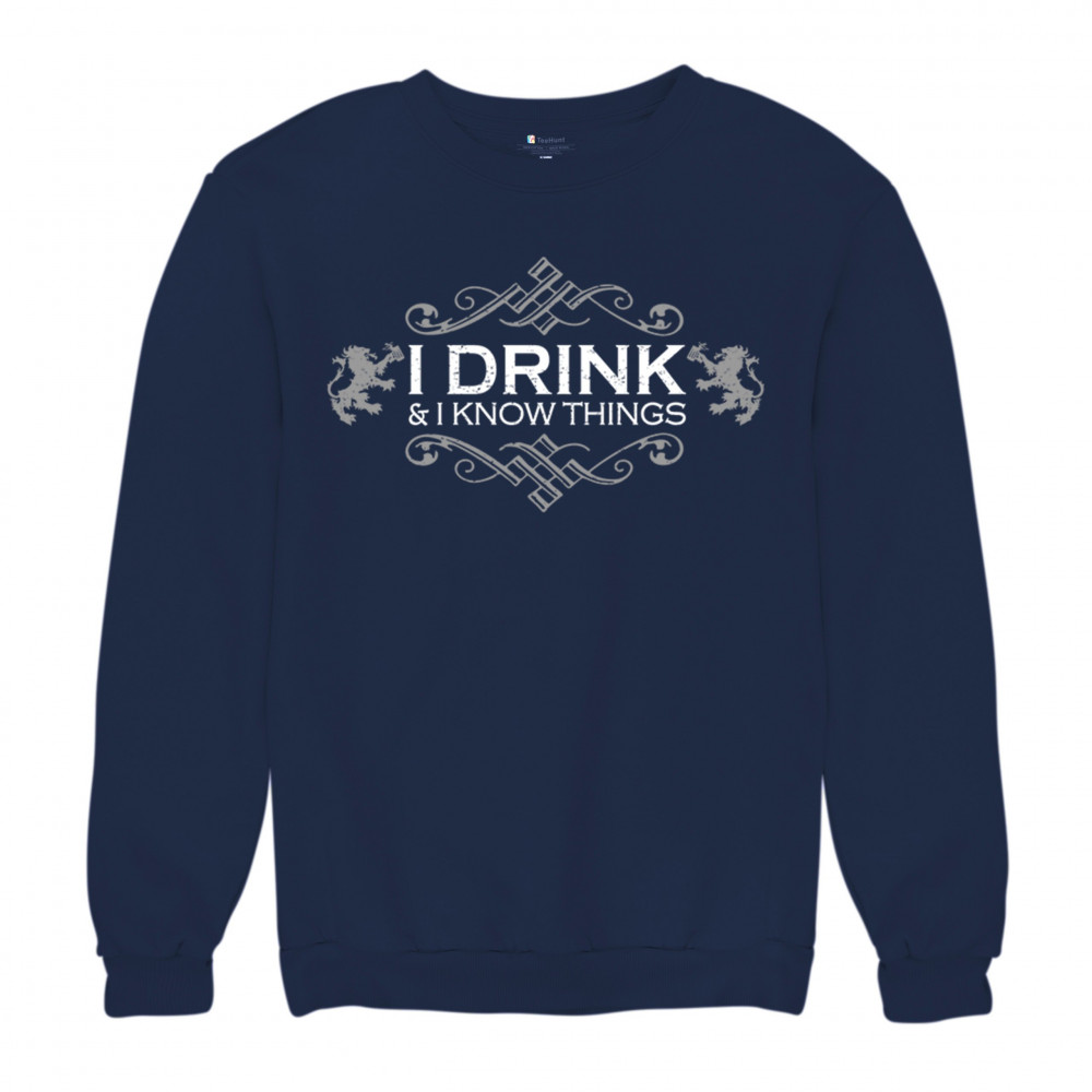 Funny fantasy design with “I Drink and I Know Things†quote, perfect for bar nights, humor lovers, trivia kings, and dry sarcasm fans.