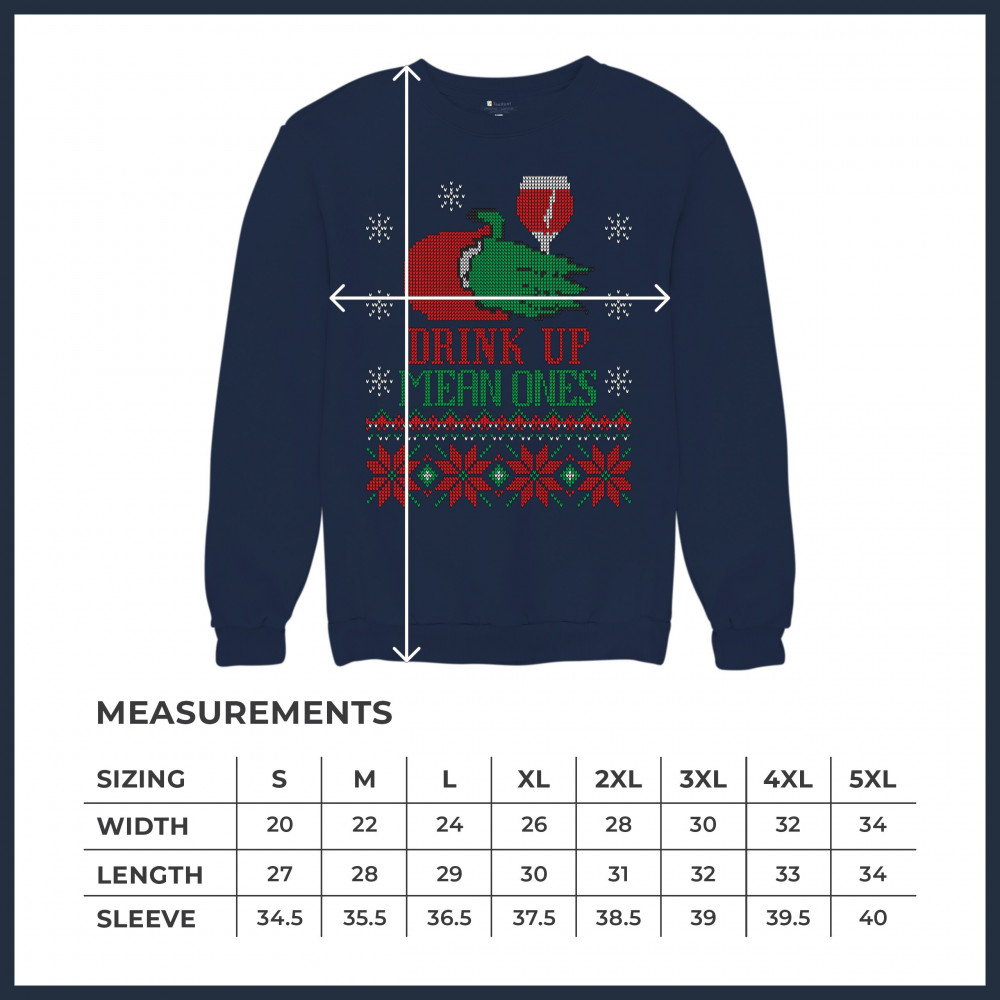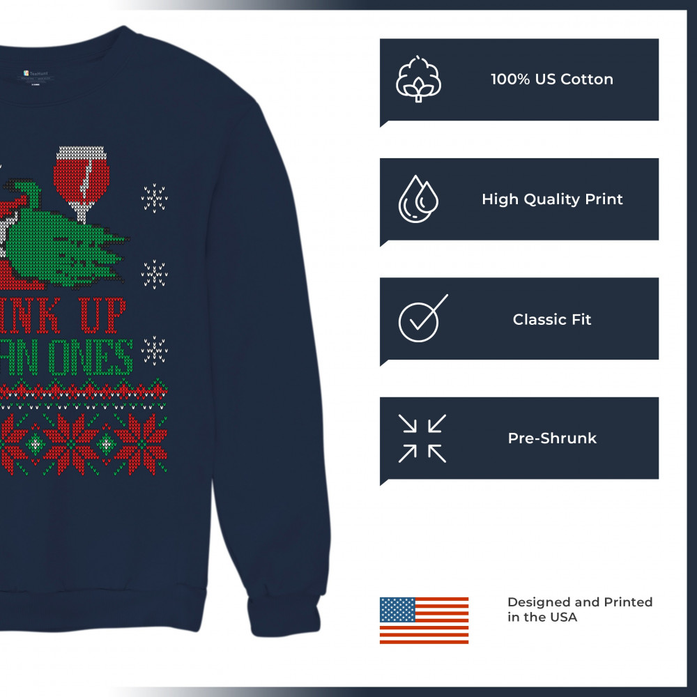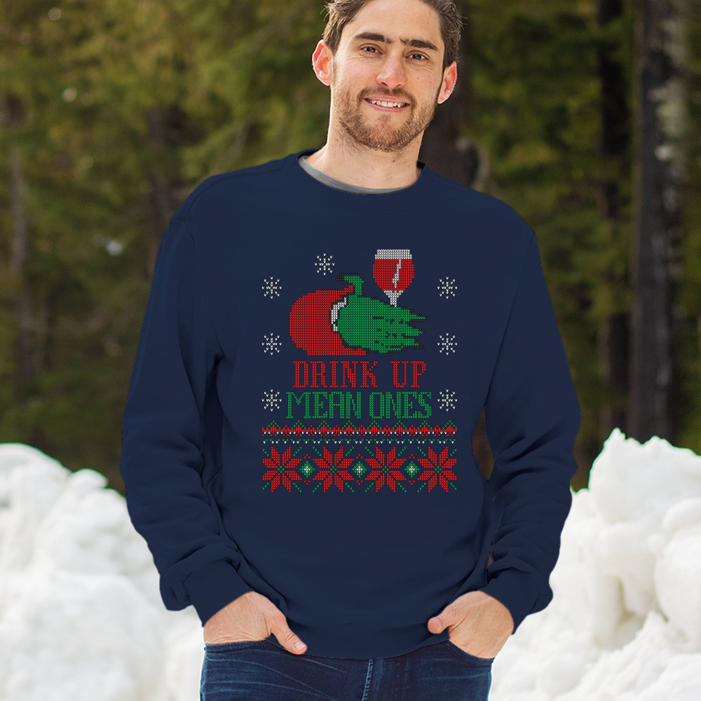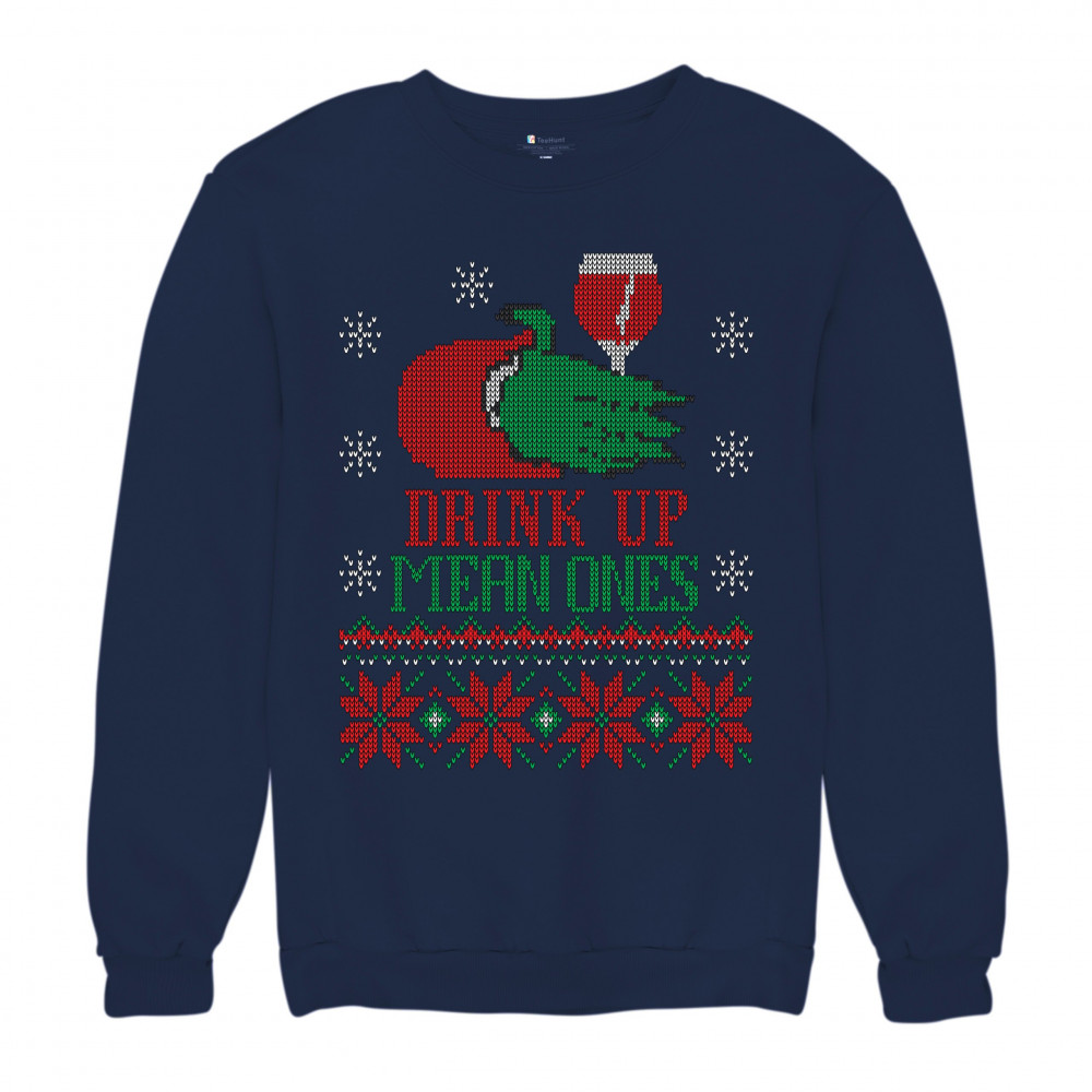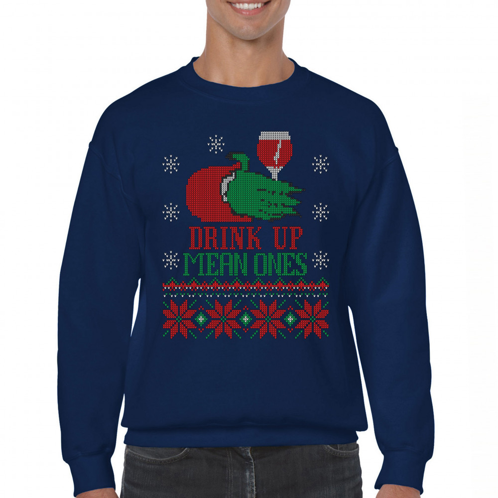 DRINK UP SCROOGES sweatshirt funny wine christmas ugly sweater party crewneck navy blue
