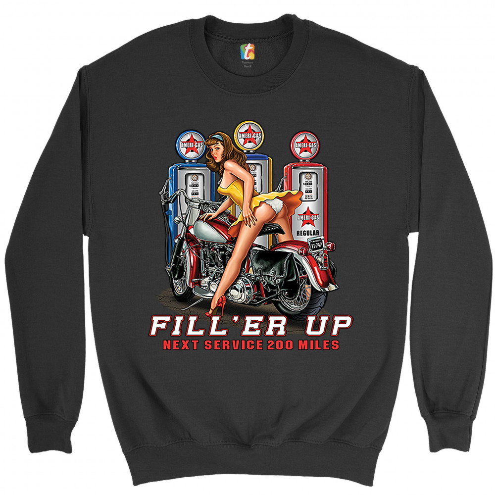 FILL 'ER UP sweatshirt sexy pin-up girl biker rider live to ride crewneck black