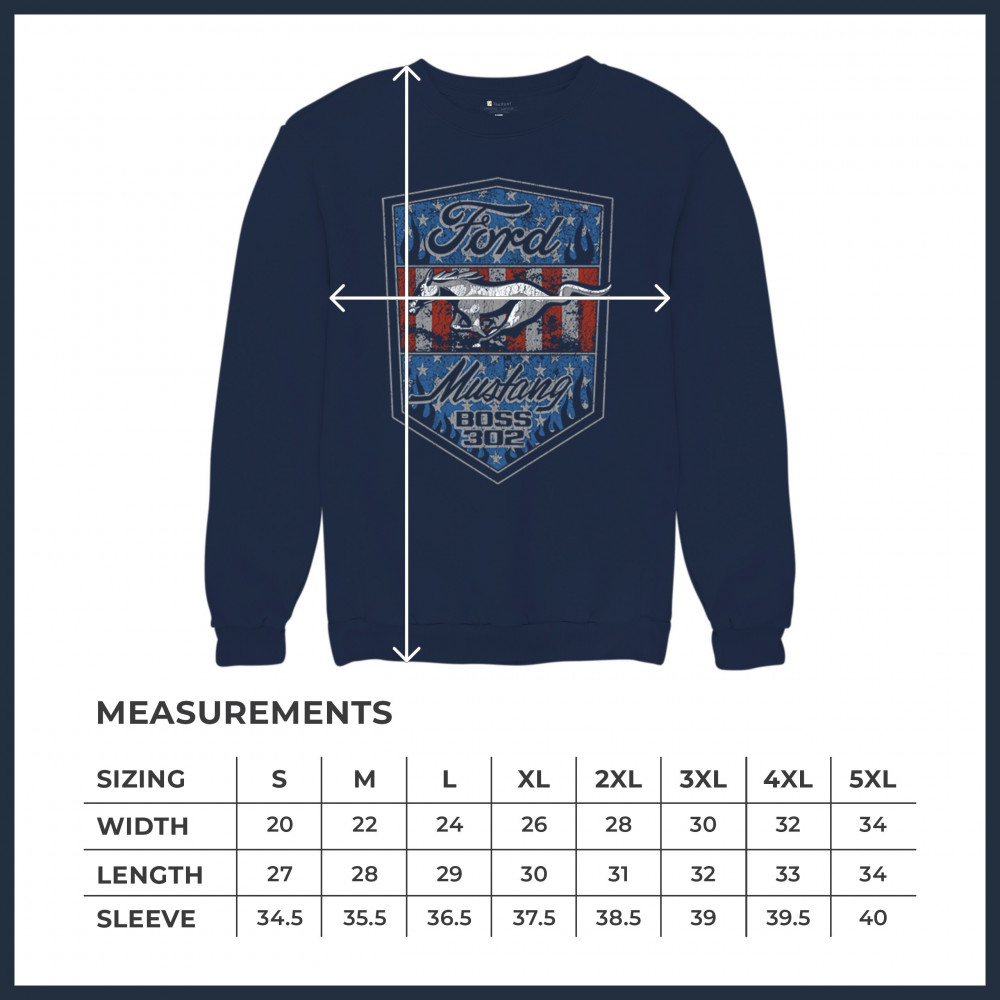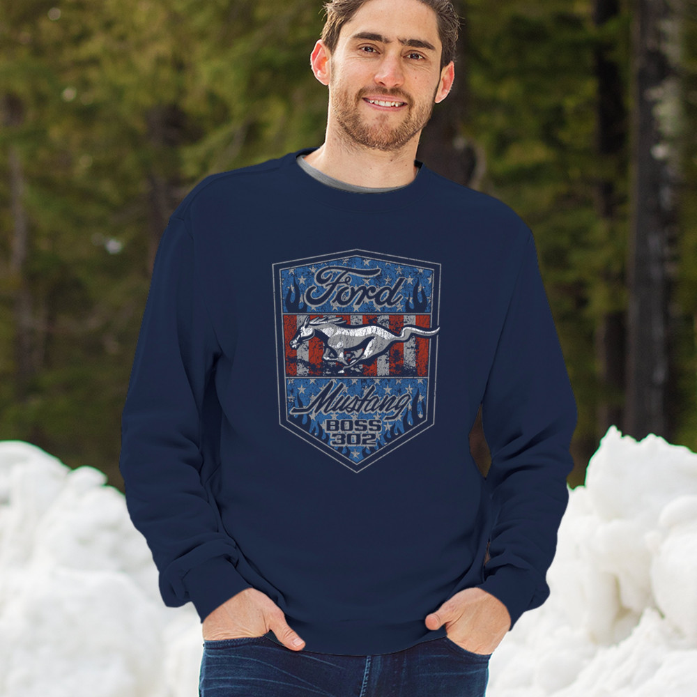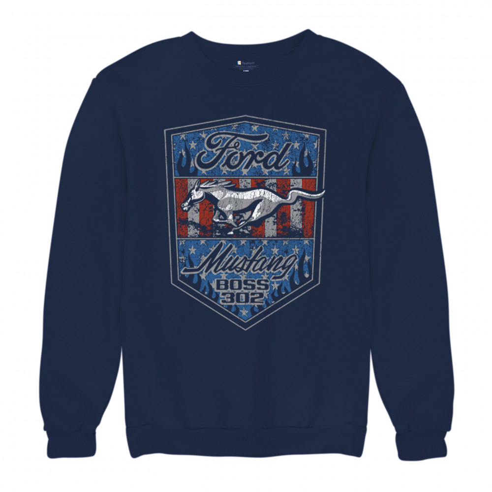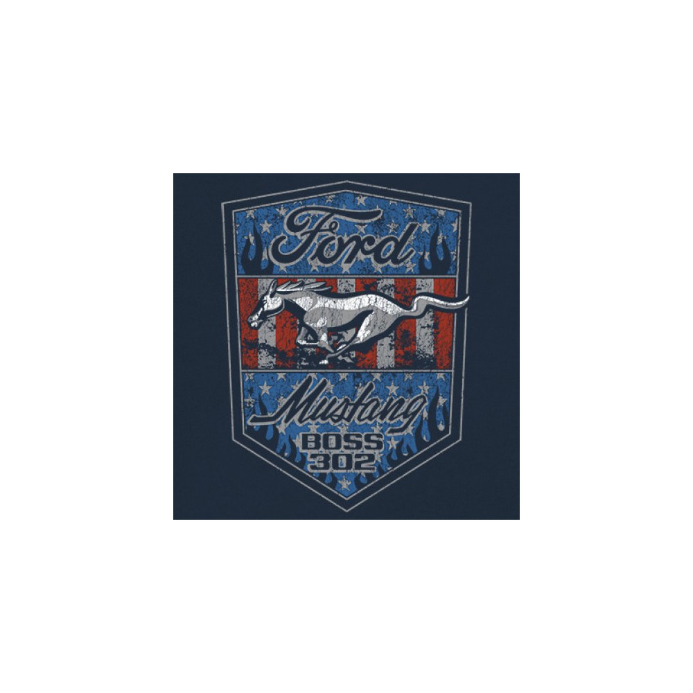 Honor the Ford Mustang Boss 302 legacy with this officially licensed patriotic design, featuring bold flames, the iconic running Mustang, and vintage American muscle style.