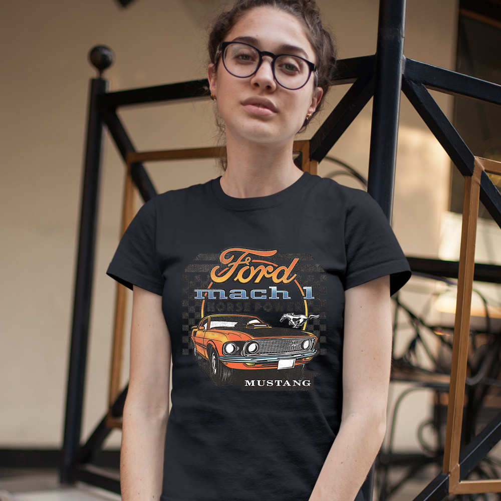 FORD MUSTANG MACH 1 t-shirt horse power american muscle licensed women's tee black