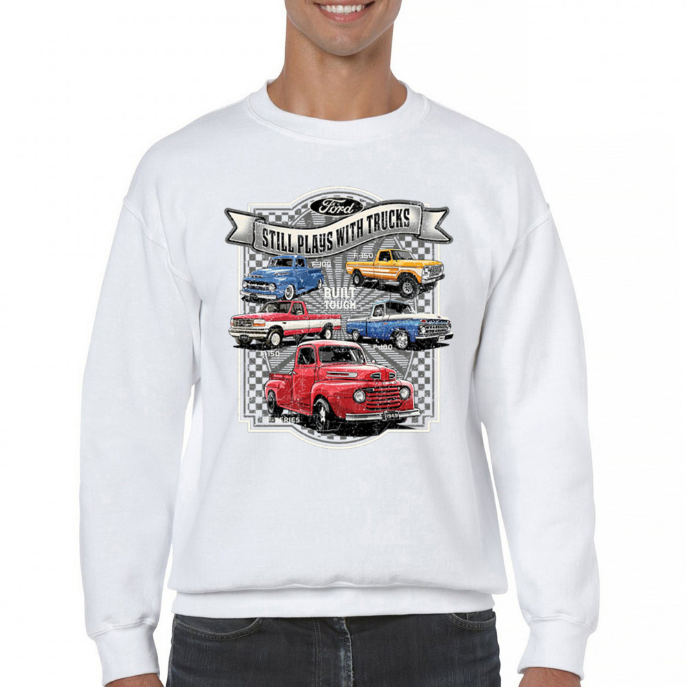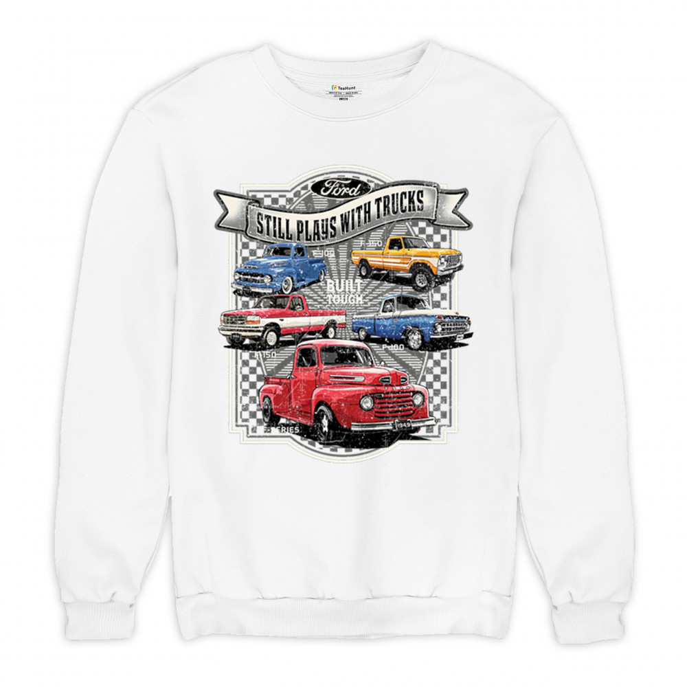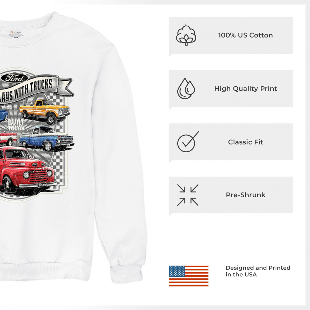 Features classic Ford F-Series trucks from 1949 to F-150. Great for vintage truck fans, garage wear, car shows, and collectors who love pickups.