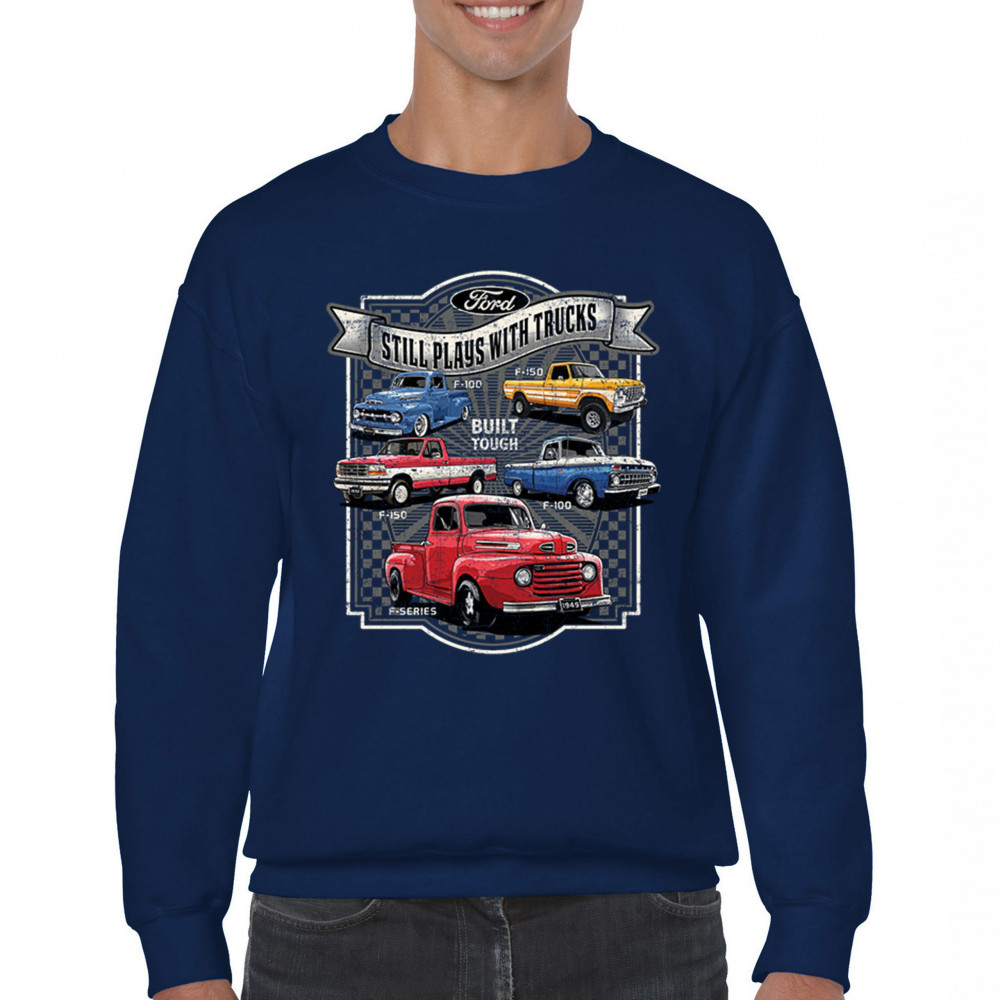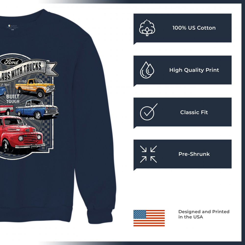 Features classic Ford F-Series trucks from 1949 to F-150. Great for vintage truck fans, garage wear, car shows, and collectors who love pickups.