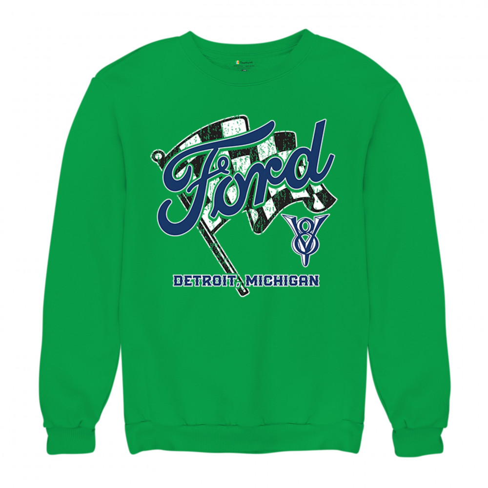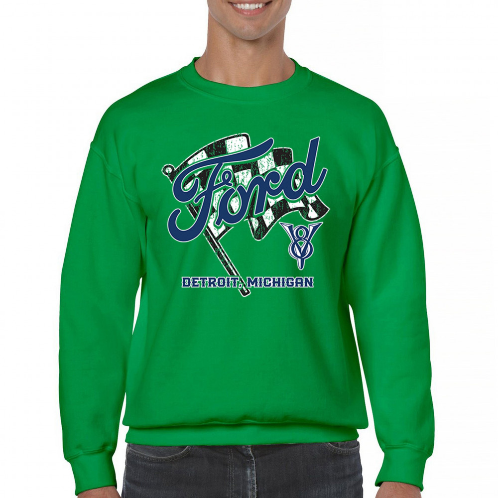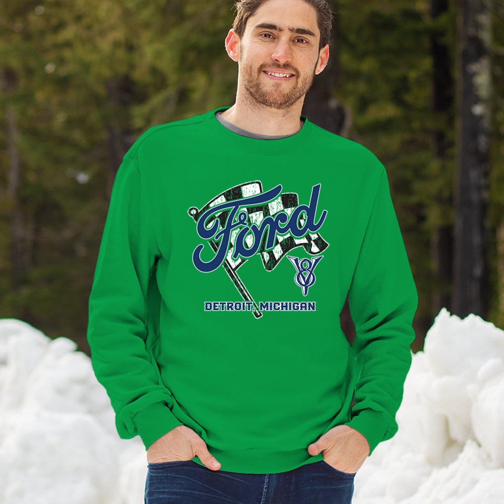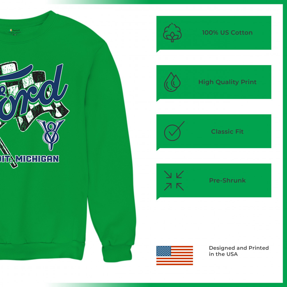 Honor Detroit, Michigan’s Ford legacy with this officially licensed design featuring a checkered flag and bold V8 emblem, perfect for muscle car fans and classic car lovers.