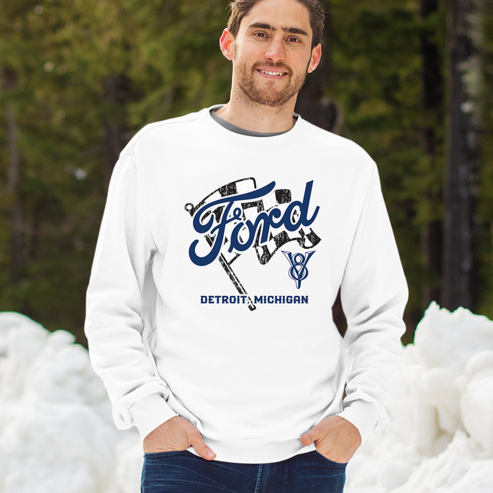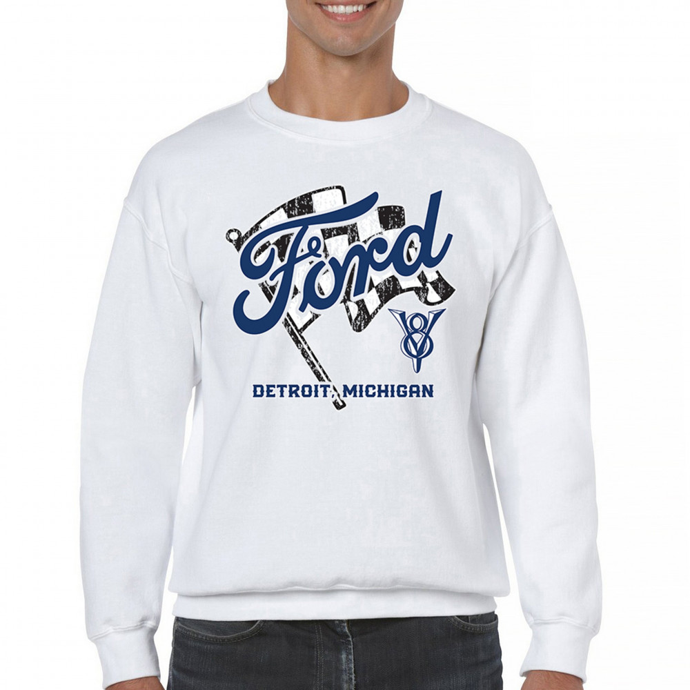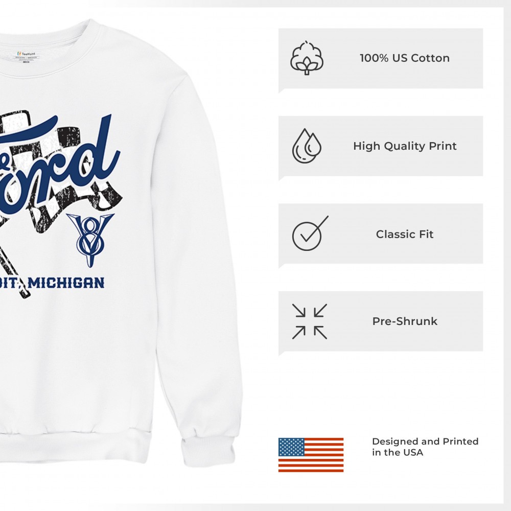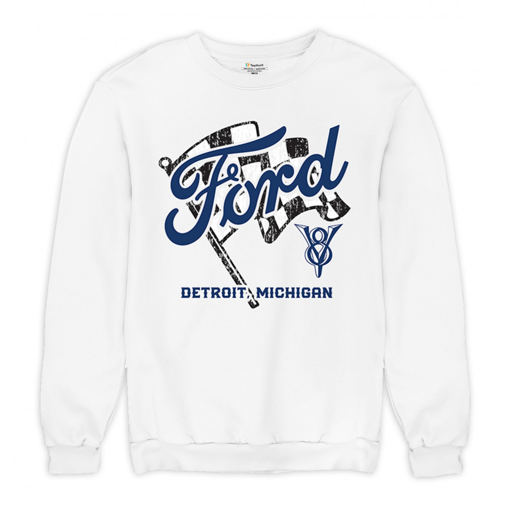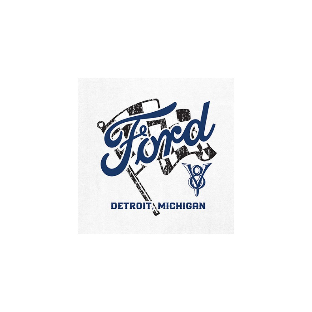 Honor Detroit, Michigan’s Ford legacy with this officially licensed design featuring a checkered flag and bold V8 emblem, perfect for muscle car fans and classic car lovers.