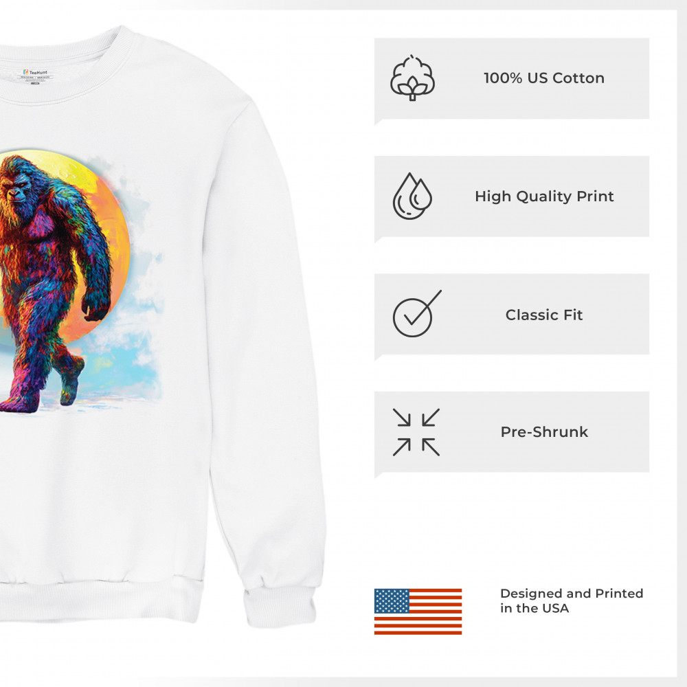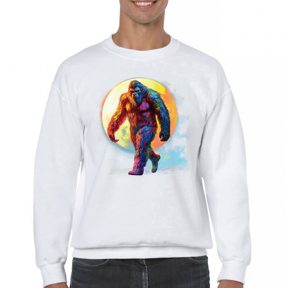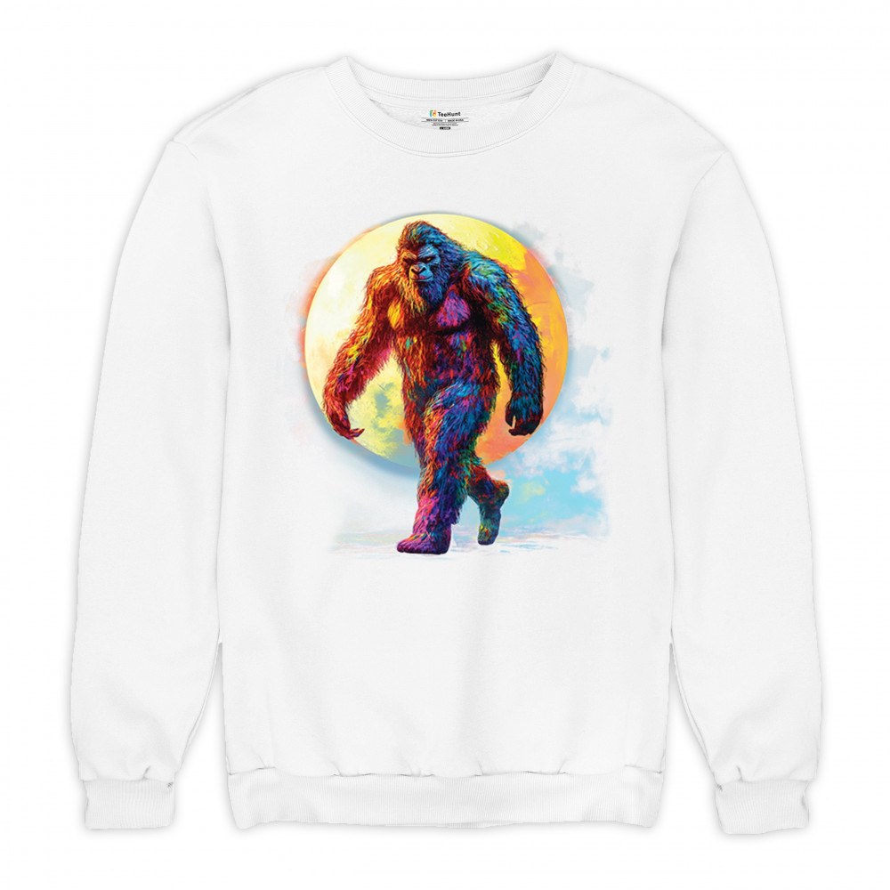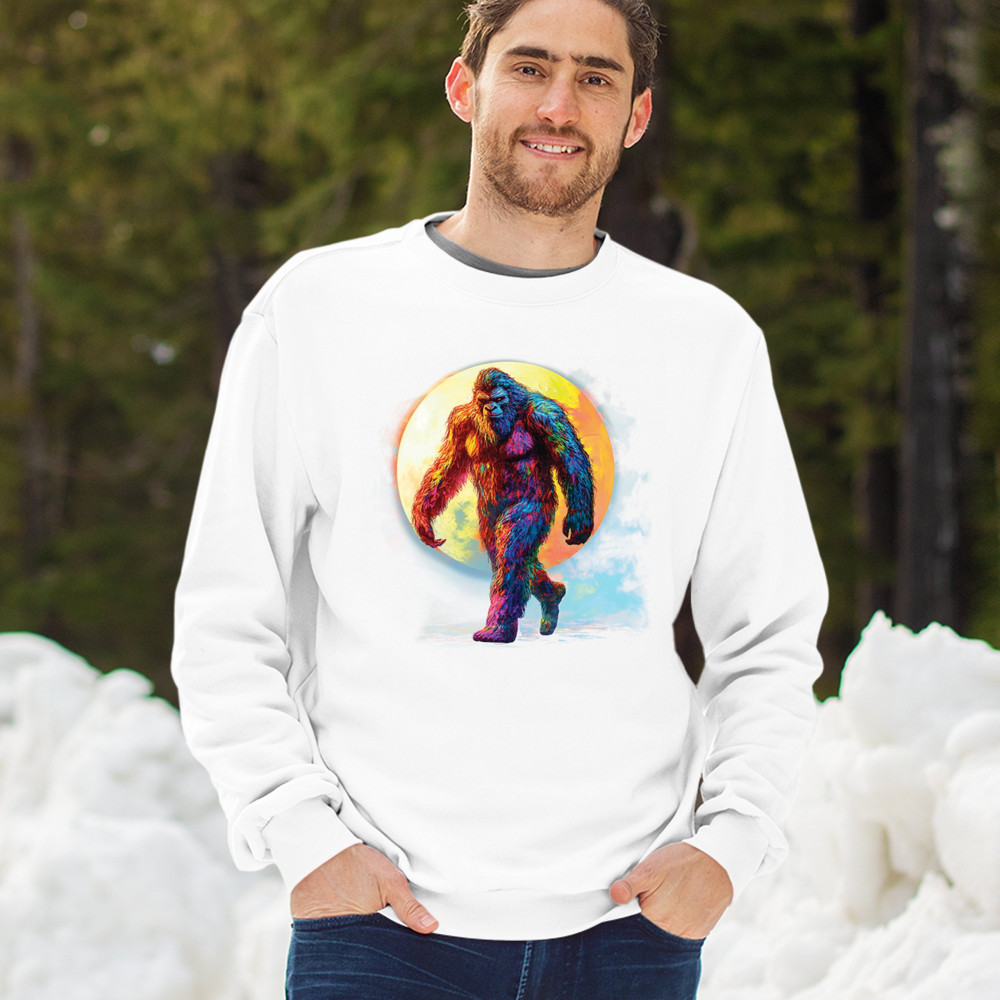 Rainbow Bigfoot under full moon design for cryptid lovers, festival goers, and psychedelic art fans. Bold, surreal, and eye-catching.
