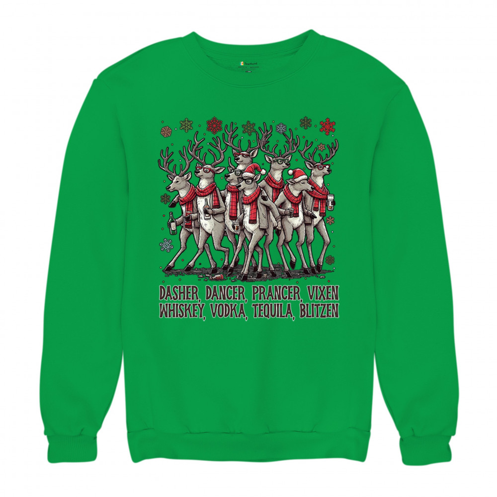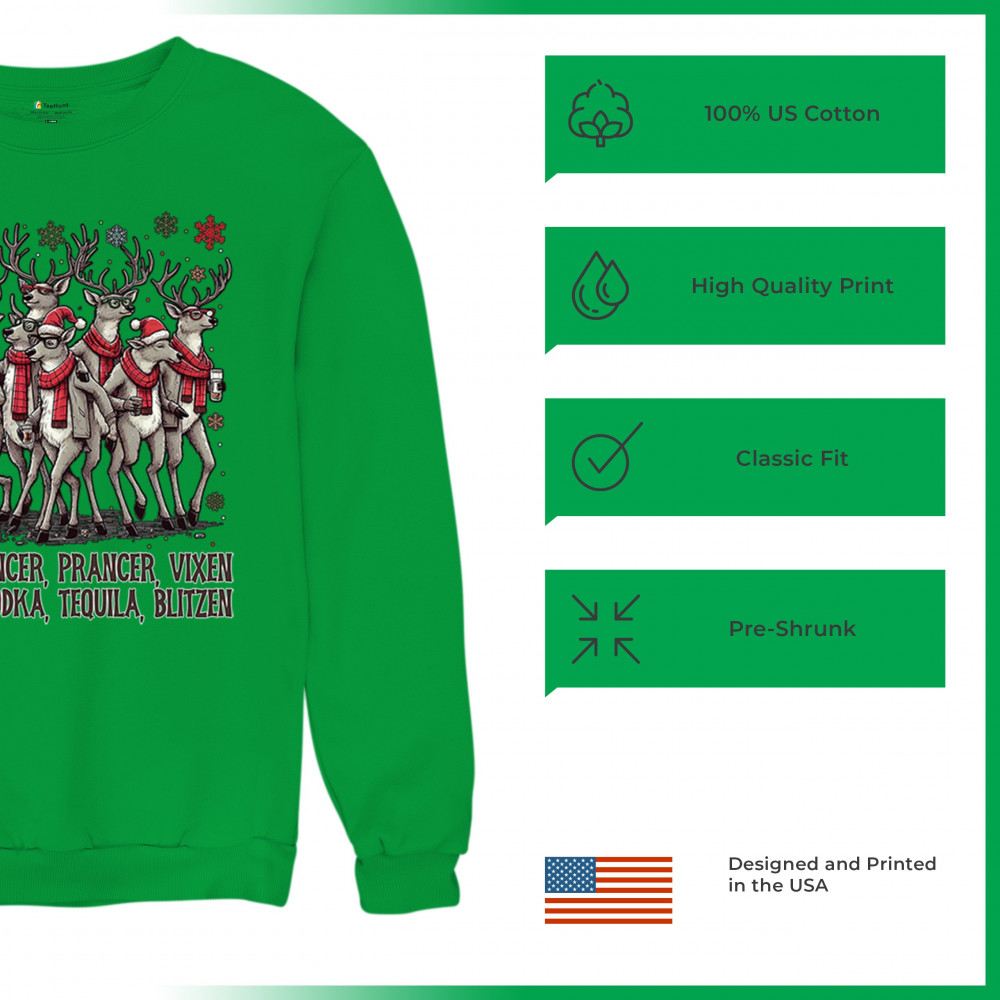 This funny holiday design features a squad of drinking reindeer carrying bottles and dressed in scarves for the ultimate Christmas party vibe. Great for bar crawls, office parties, winter gatherings, adult holiday events, white elephant exchanges, festive nights out, and anyone who loves spirited Christmas humor with a cheeky personality.