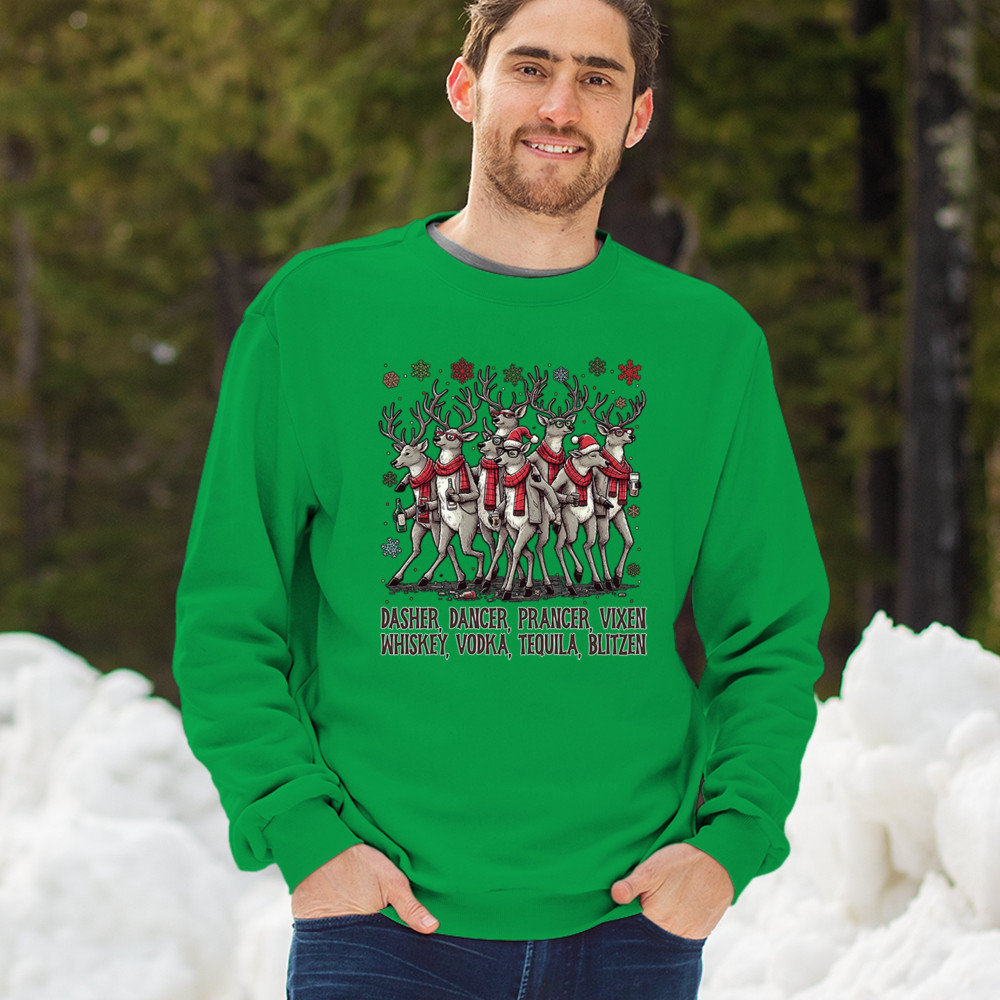 Funny drinking-reindeer Christmas design perfect for parties, bar crawls, and festive adult humor. Great for holiday laughs and spirited winter fun.