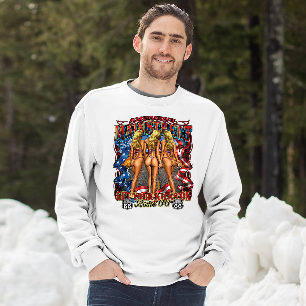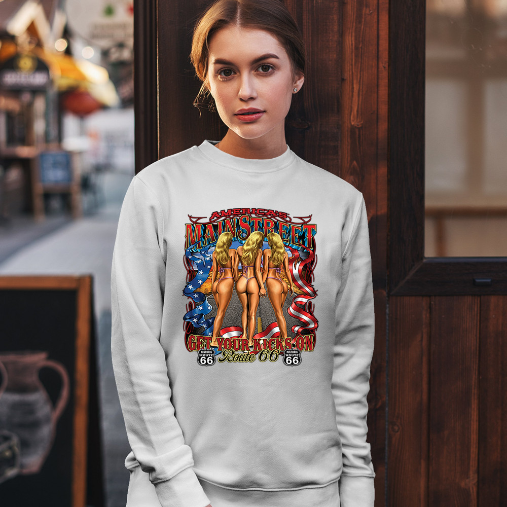 A print featuring three scantily-clad blondes holding each other's hands walking on a highway. The print says: "America's Main Street, Get Your Kicks on Route 66" and also features a ribbon with stars and stripes on it and two "Historic Route 66" signs. A