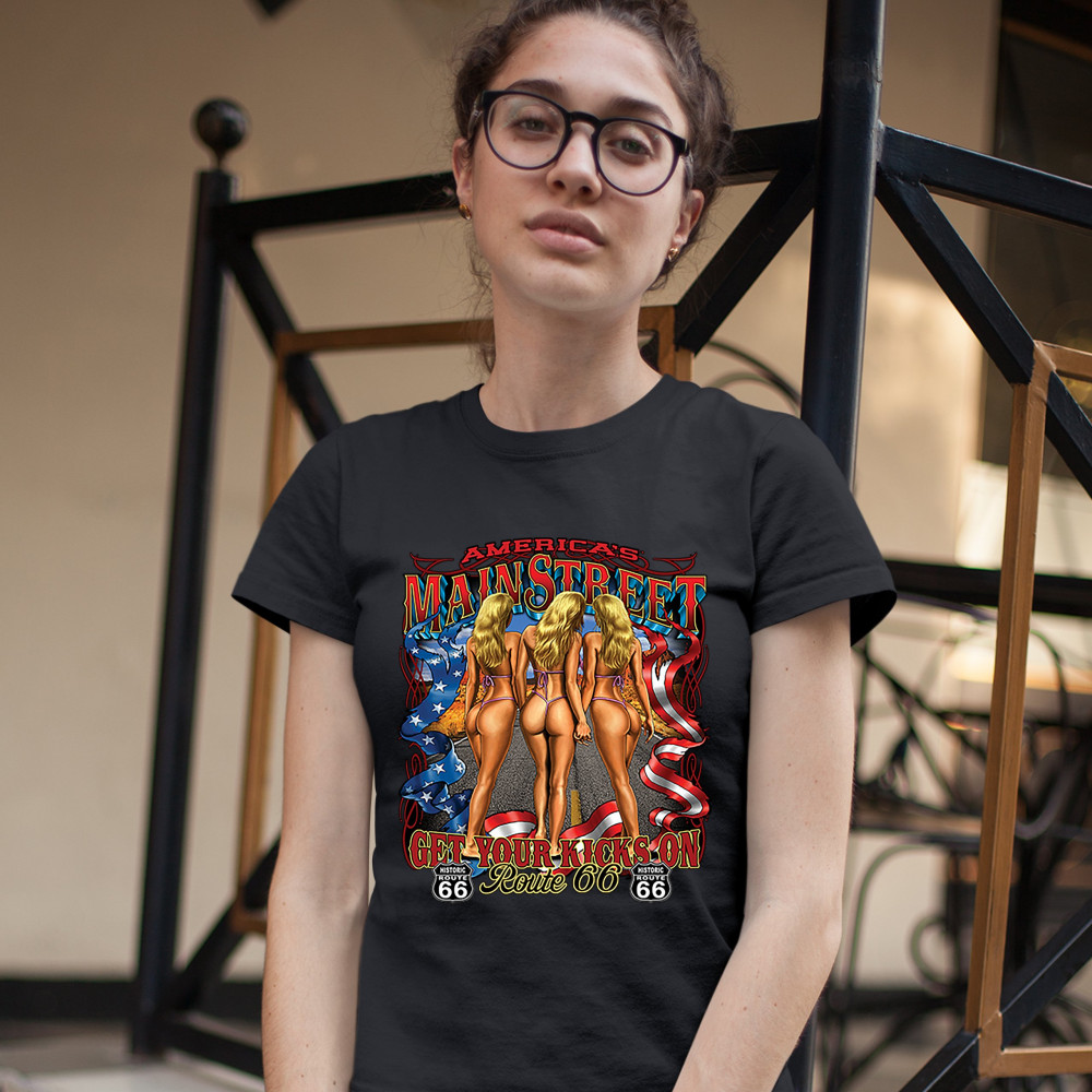 A print featuring three scantily-clad blondes holding each other's hands walking on a highway. The print says: "America's Main Street, Get Your Kicks on Route 66" and also features a ribbon with stars and stripes on it and two "Historic Route 66" signs. A