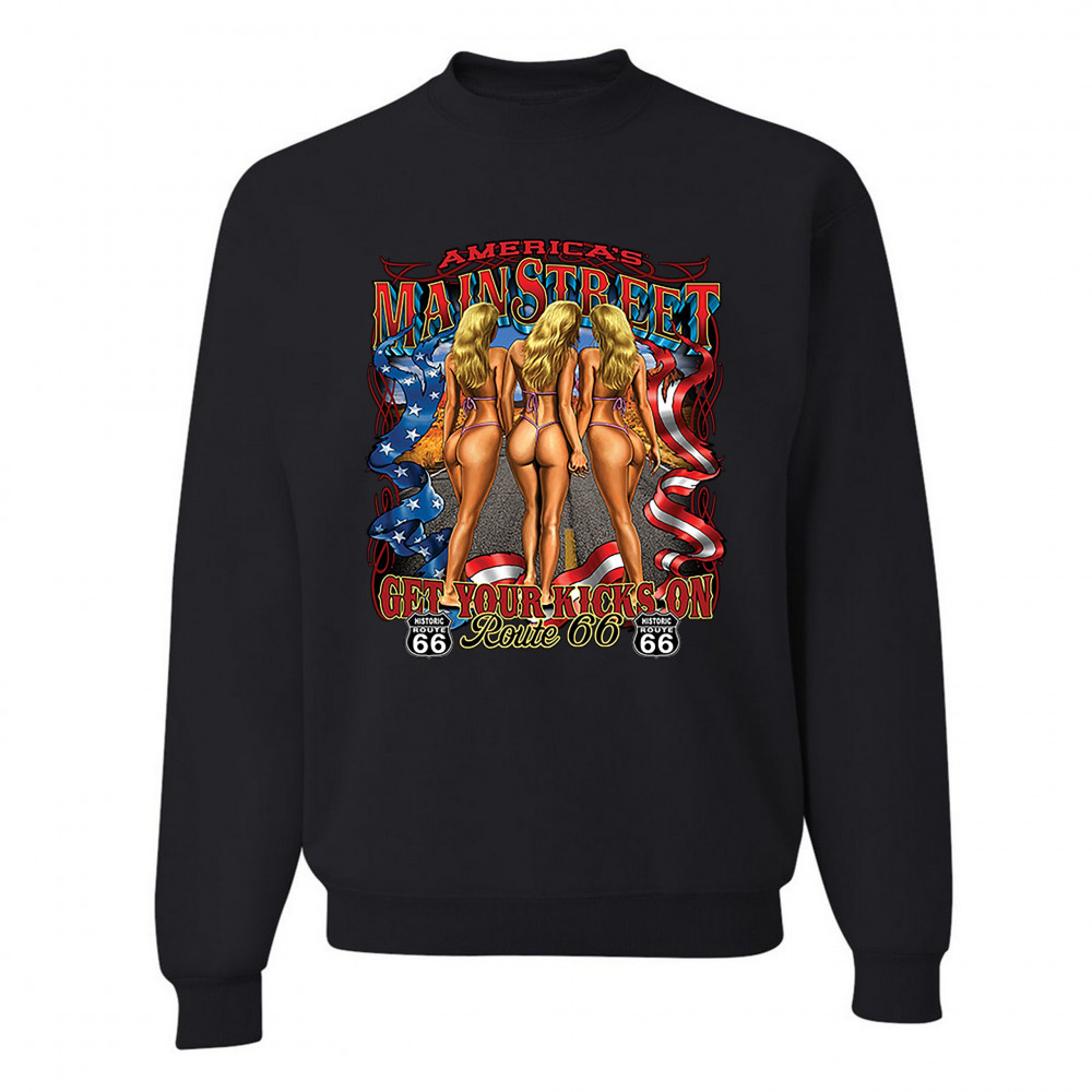 A print featuring three scantily-clad blondes holding each other's hands walking on a highway. The print says: "America's Main Street, Get Your Kicks on Route 66" and also features a ribbon with stars and stripes on it and two "Historic Route 66" signs. A