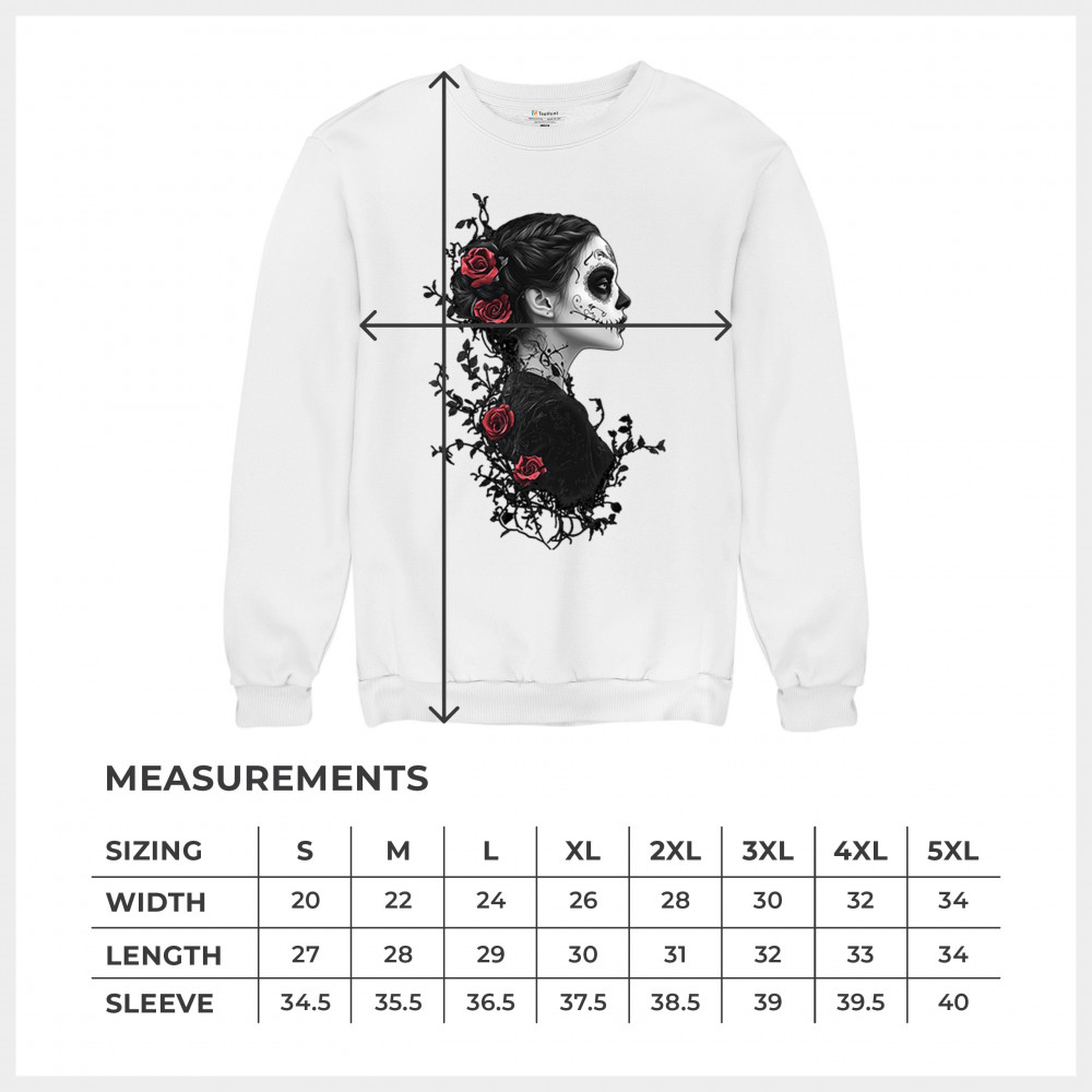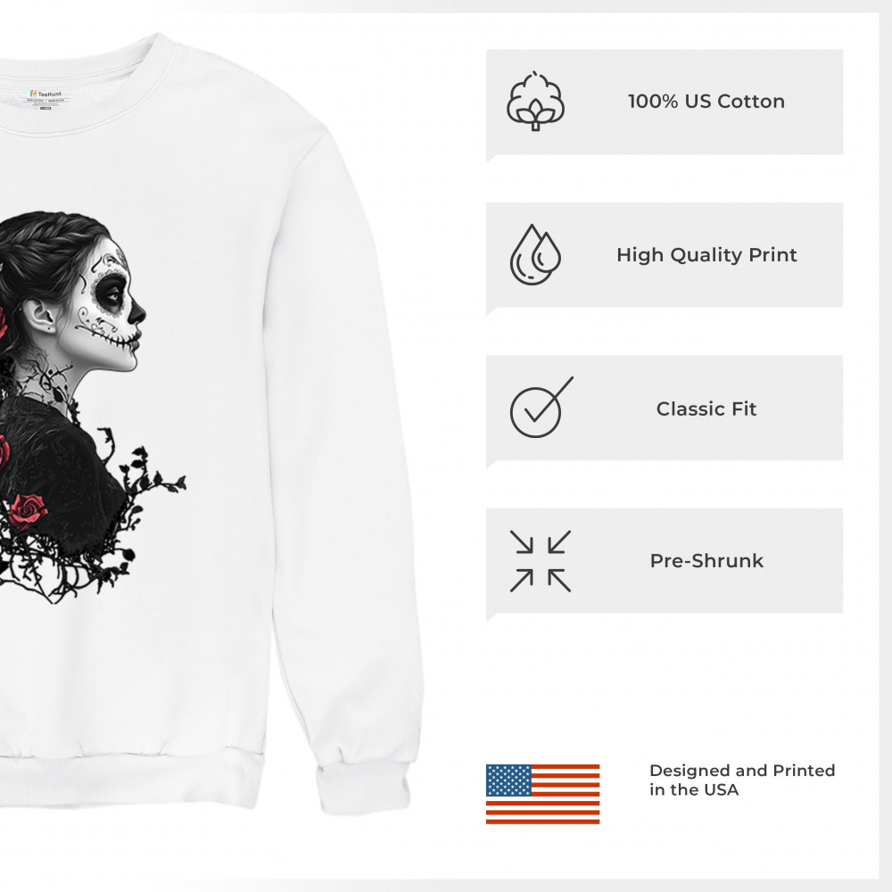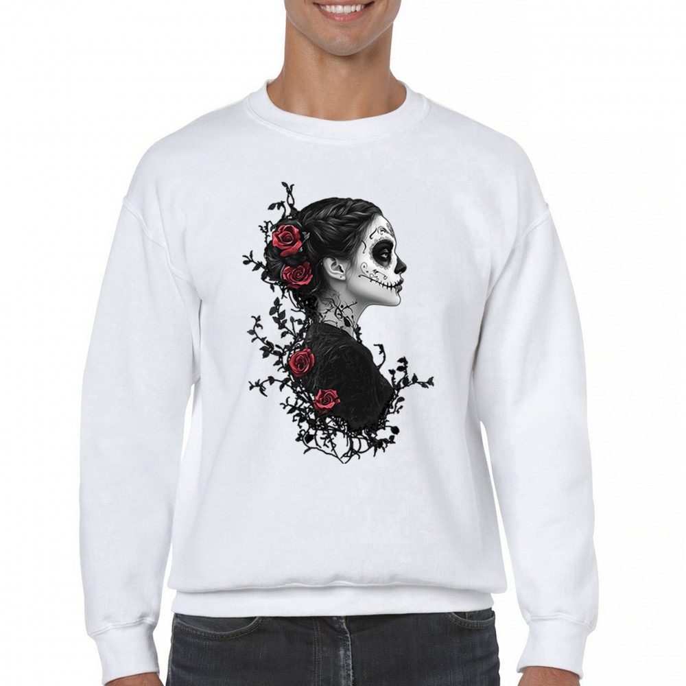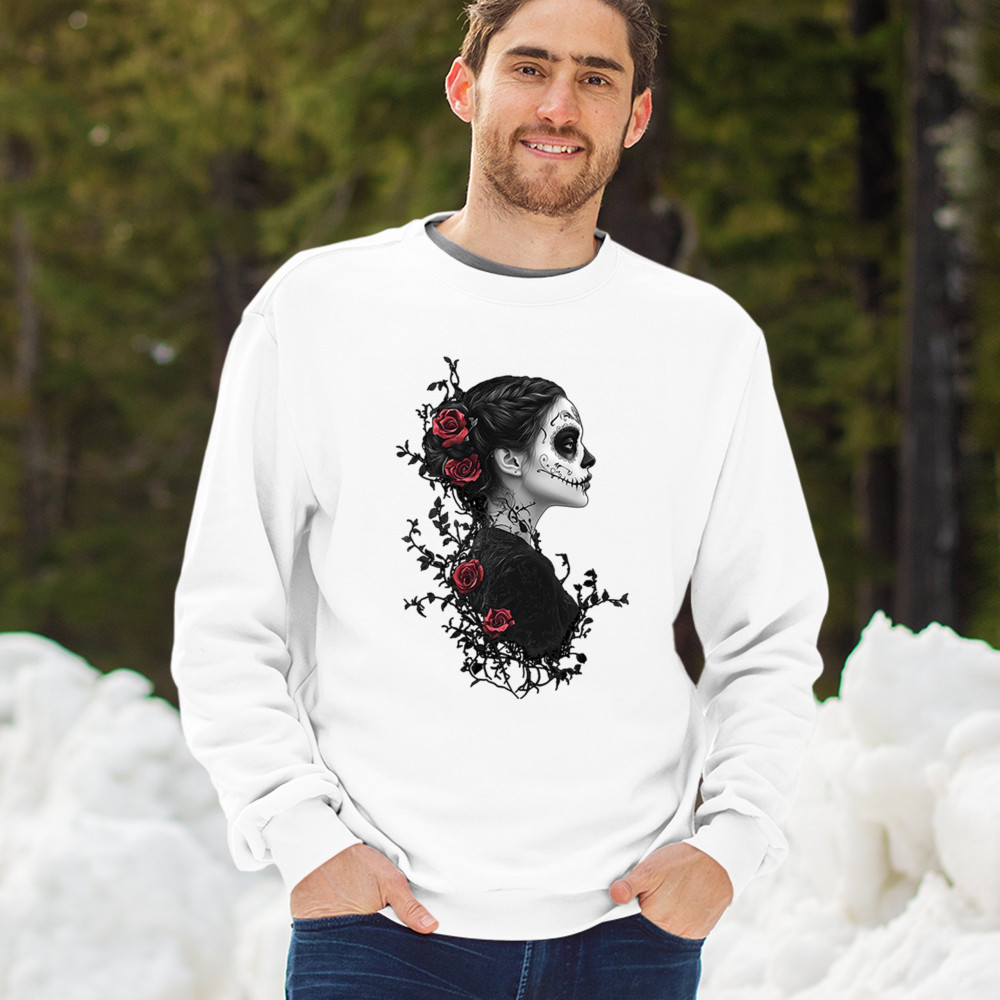 Celebrate Dia de los Muertos in style with this refined sugar skull woman design. Featuring a side profile view, vibrant red roses, and dark gothic floral elements, it creates a graceful balance between mystery and beauty. Ideal for fans of macabre art, skull themes, and honoring ancestral traditions through elegant visuals.