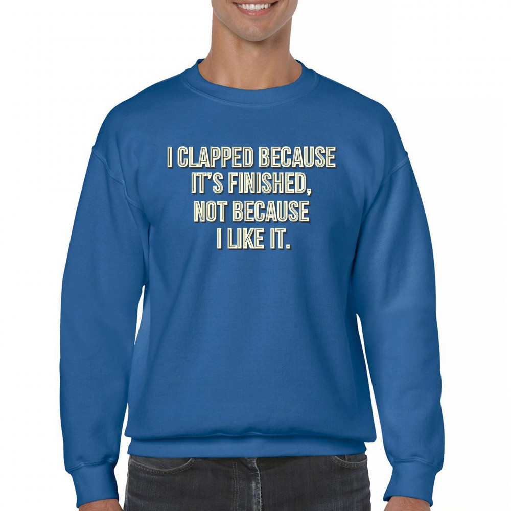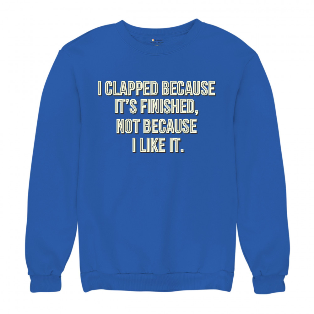I CLAPPED BECAUSE IT'S FINISHED NOT BECAUSE I LIKE IT sweatshirt funny crewneck royal blue